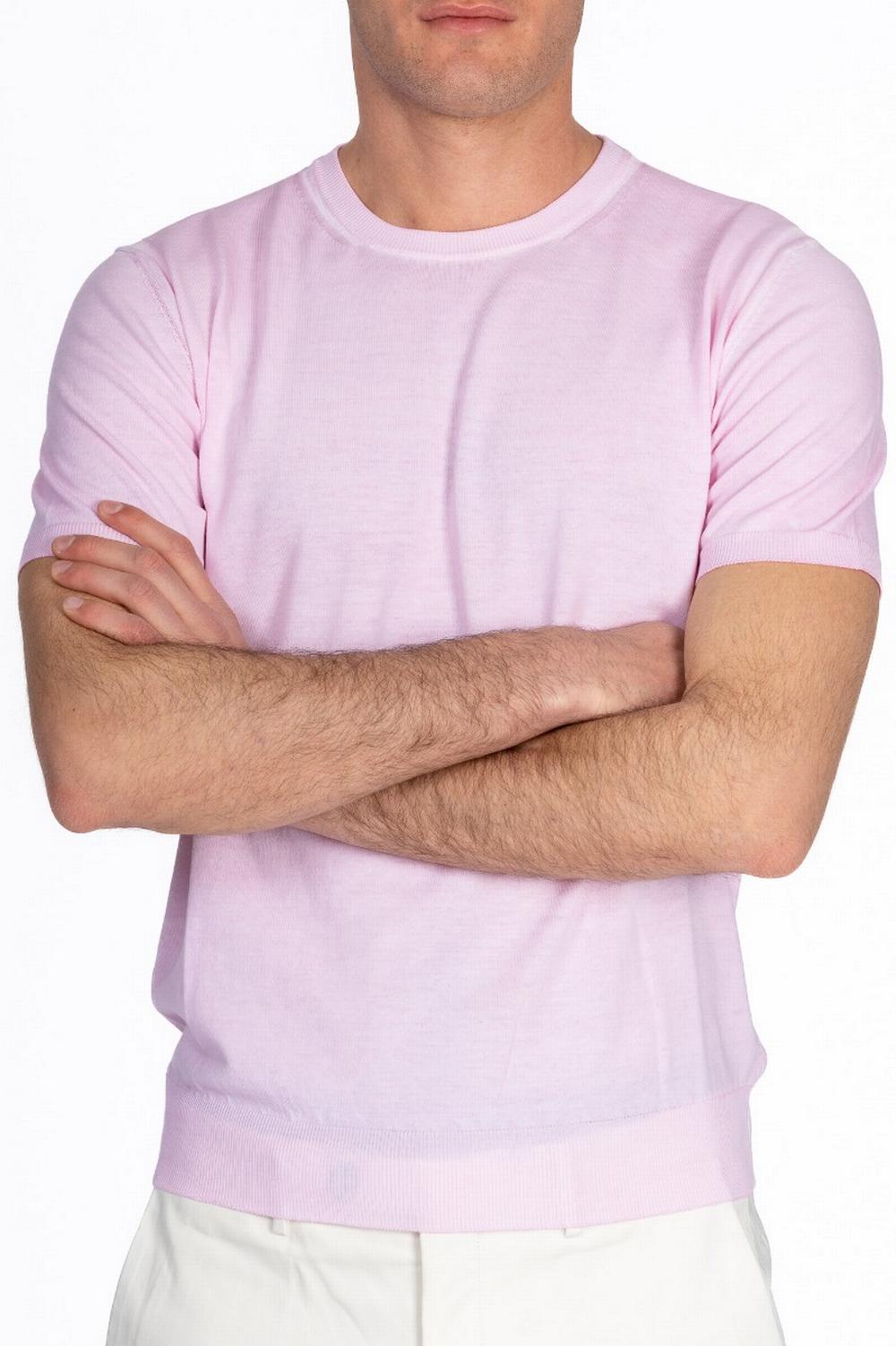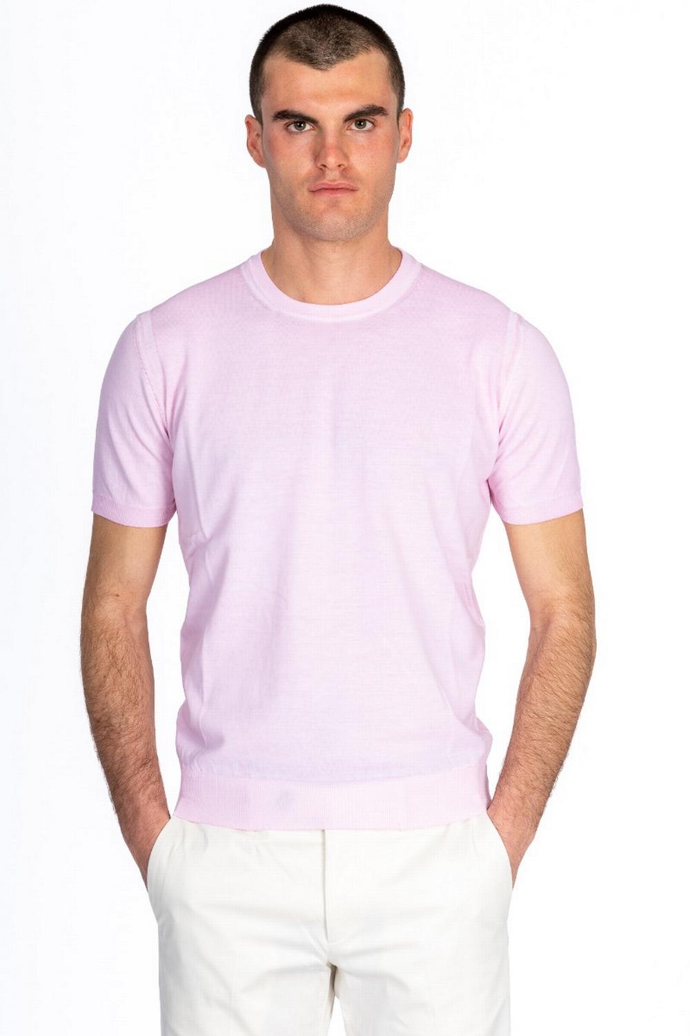 T-shirt in maglia di cotone color rosa confetto. Maniche corte. Scollo a giro e linea dritta. Calature a vista, collo, polsi e fondo a costina.