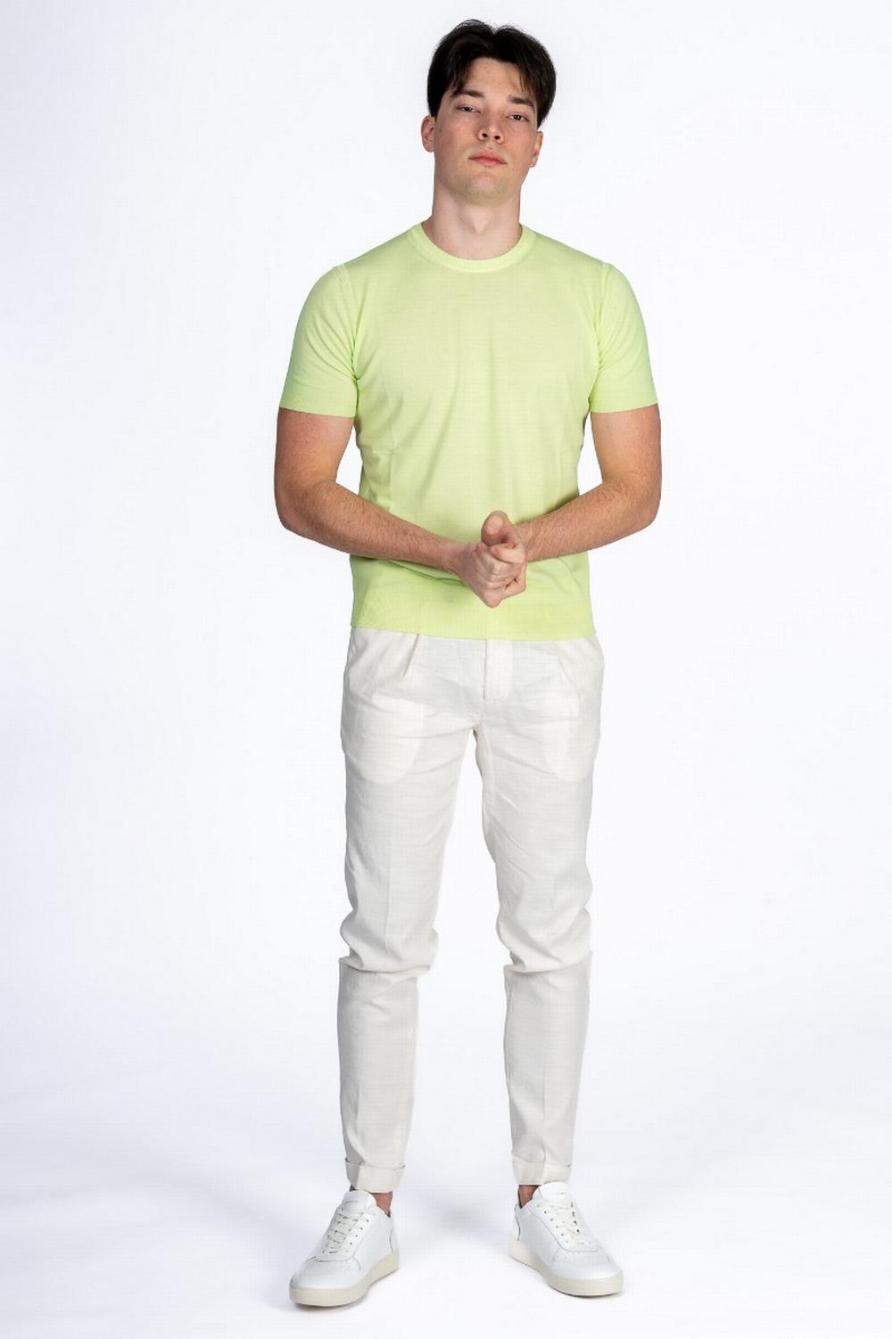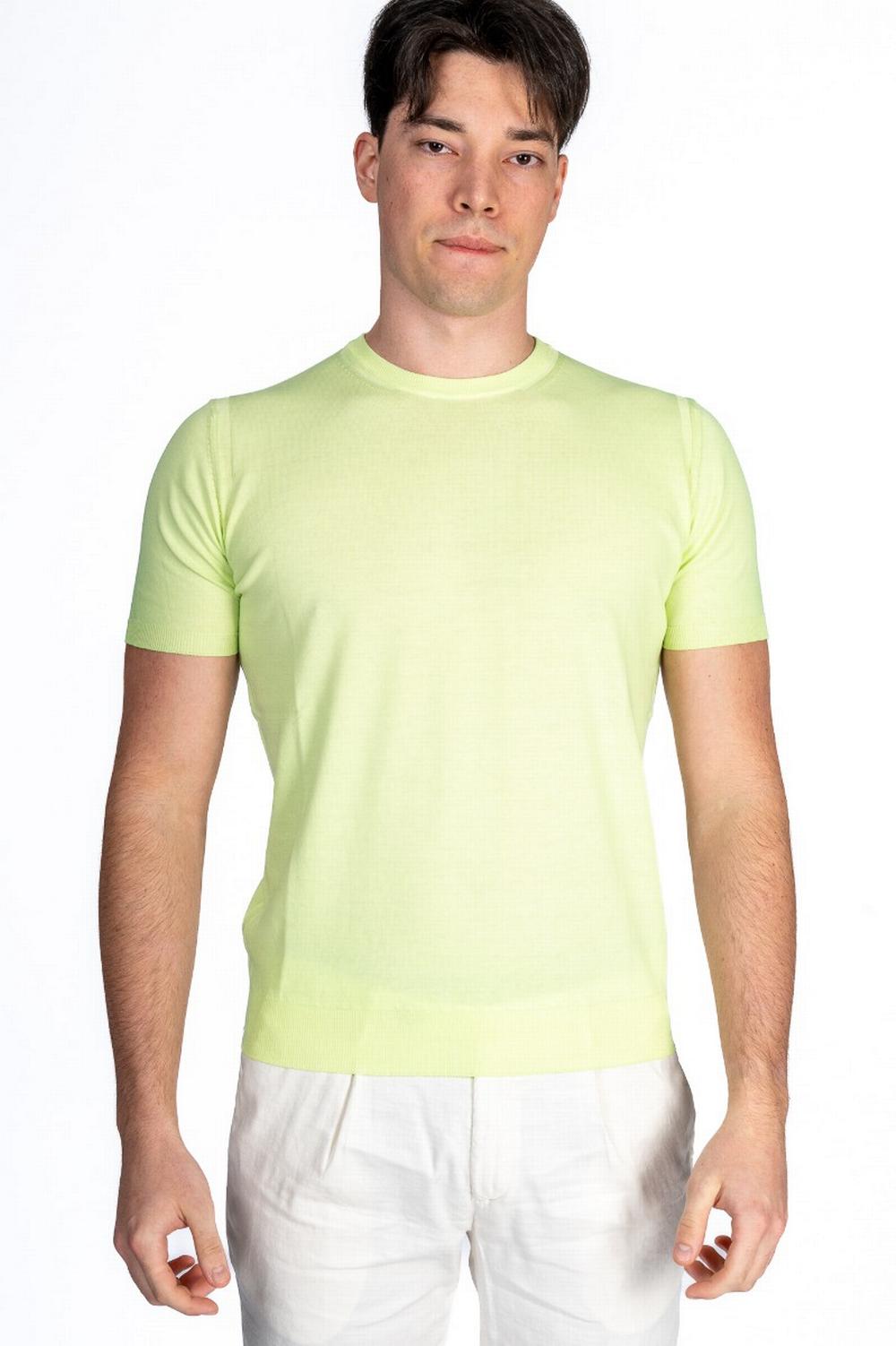 T-shirt in maglia di cotone color verde fluo. Maniche corte. scollo a giro e linea dritta. Calature a vista, collo, polsi e fondo a costina.