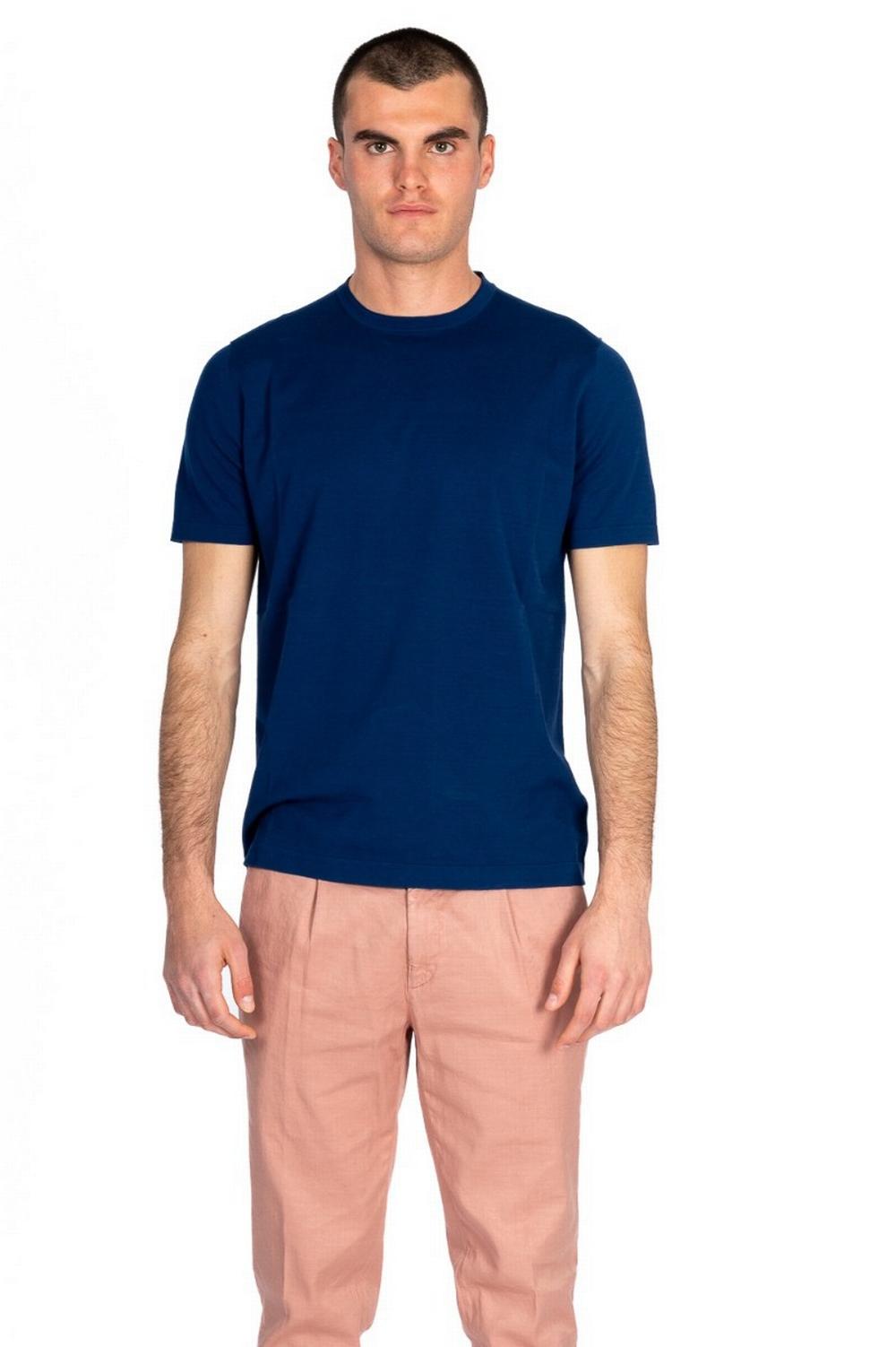 T-shirt in maglia di cotone color blu marino. Linea dritta, maniche corte. Collo a giro con profilo a rotolino.