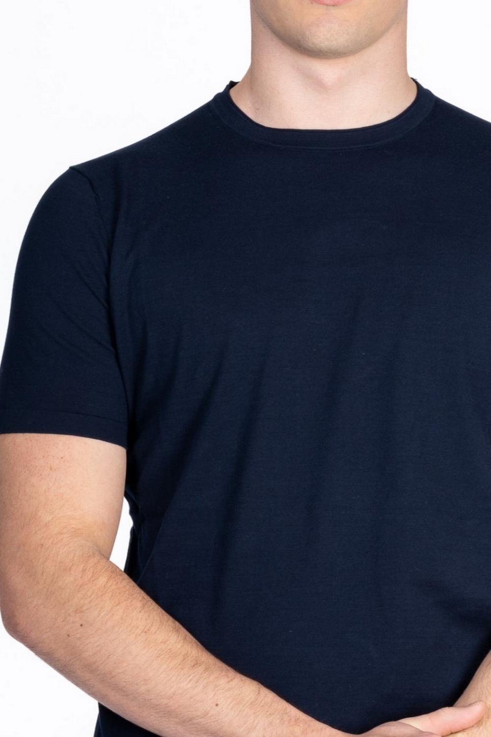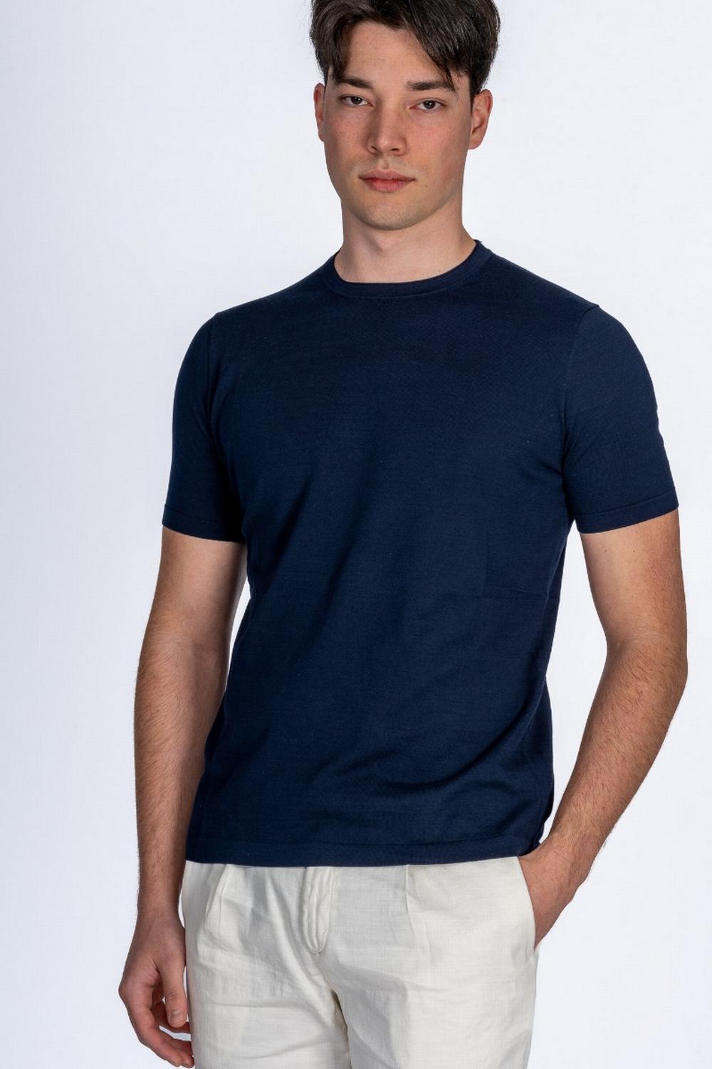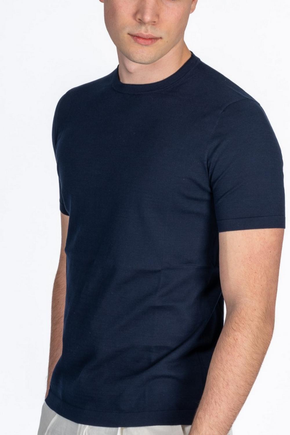 T-shirt in maglia di cotone color blu navy. Linea dritta, maniche corte. Collo a giro con profilo a rullino.