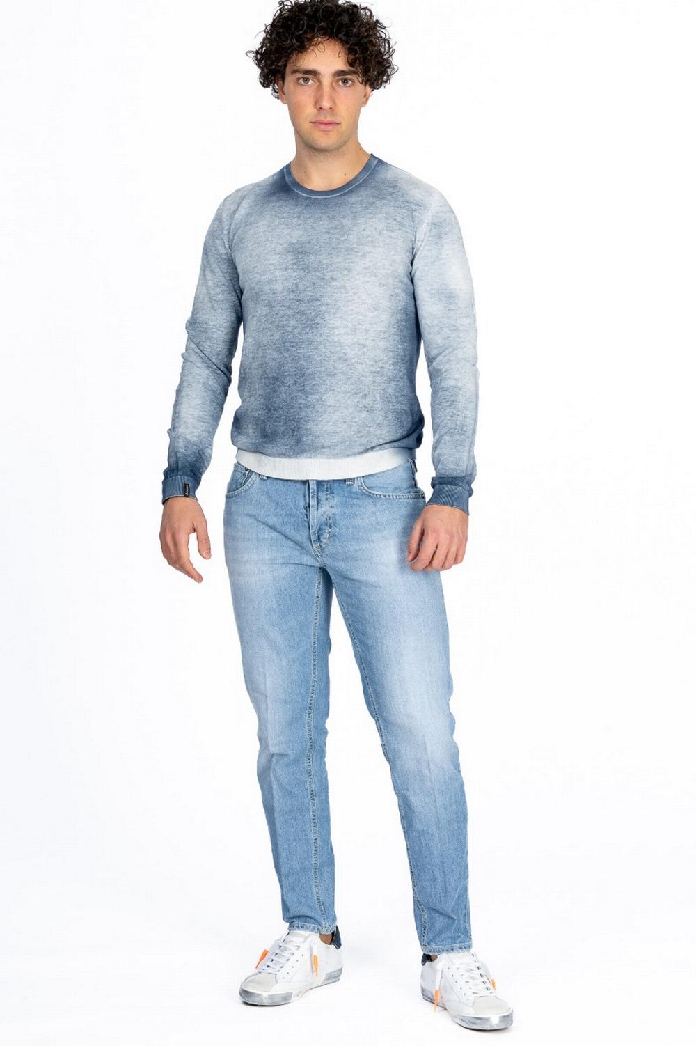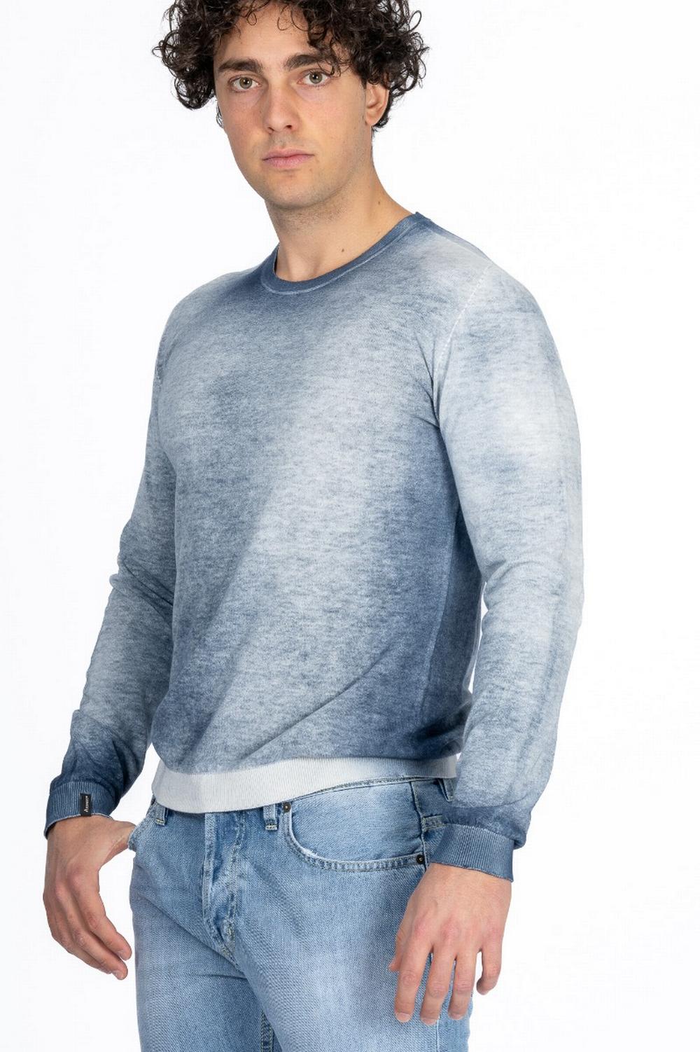 T-shirt in tela di cotone rustica. Maniche lunghe, scollo a giro e fondo a costina. Due spacchetti laterali sul fondo. Modello seamless, prodotto utilizzando un unico filato senza cuciture laterali. Indossabile anche a rovescio, colore blu chiaro non uniforme e con sfumature da un lato e blu tinta unita dall'altro lato.