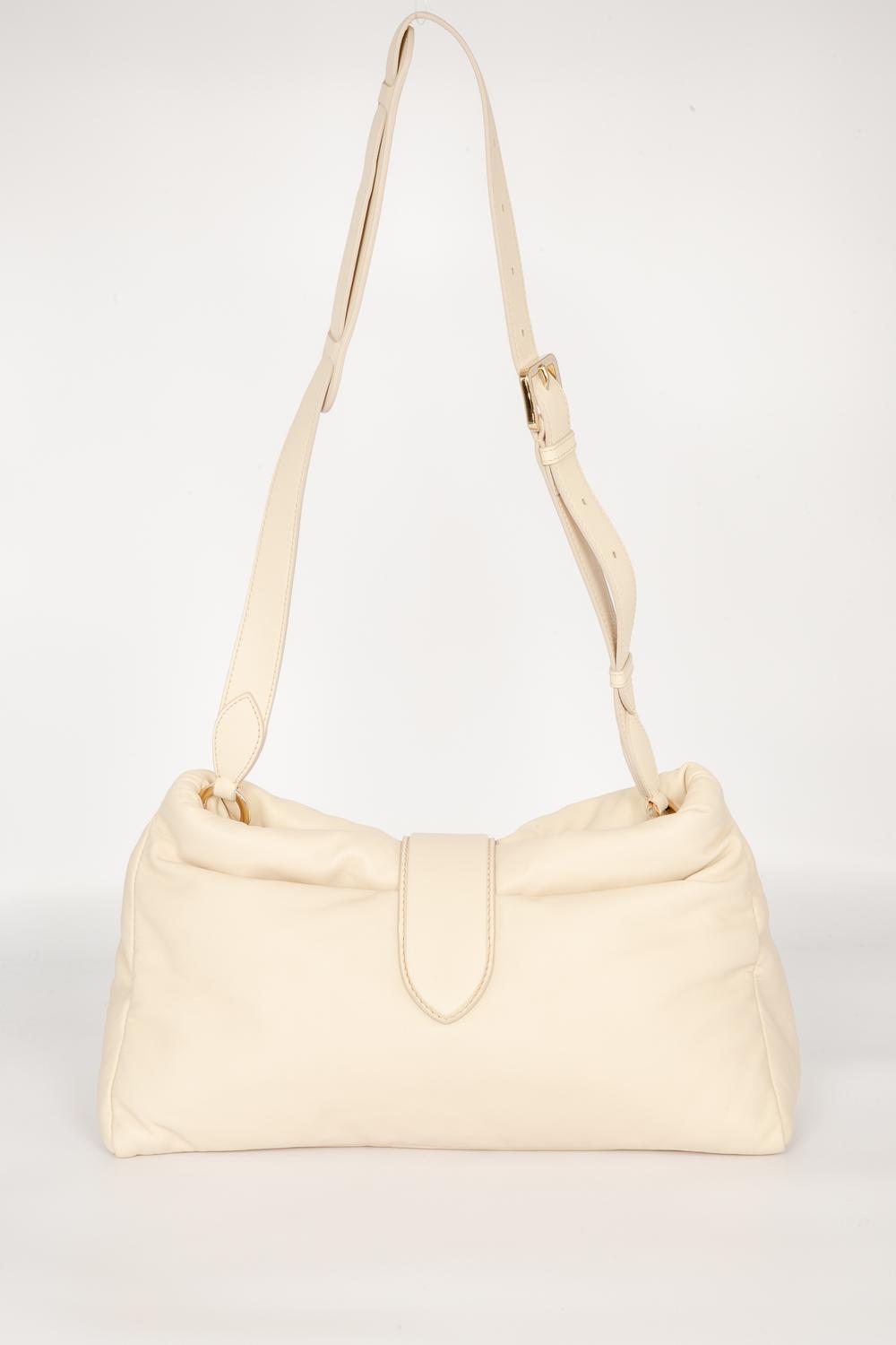 Maxi clutch in morbida nappa color avorio. Tracolla removibile in pelle, con spallaccio. Chiusura con zip e gancio a girello, rivestito in pelle, con logo. Imbottita in Camelux, ricavato dall'upcycling dei capi in cammello. Una tasca interna con zip e una aperta.