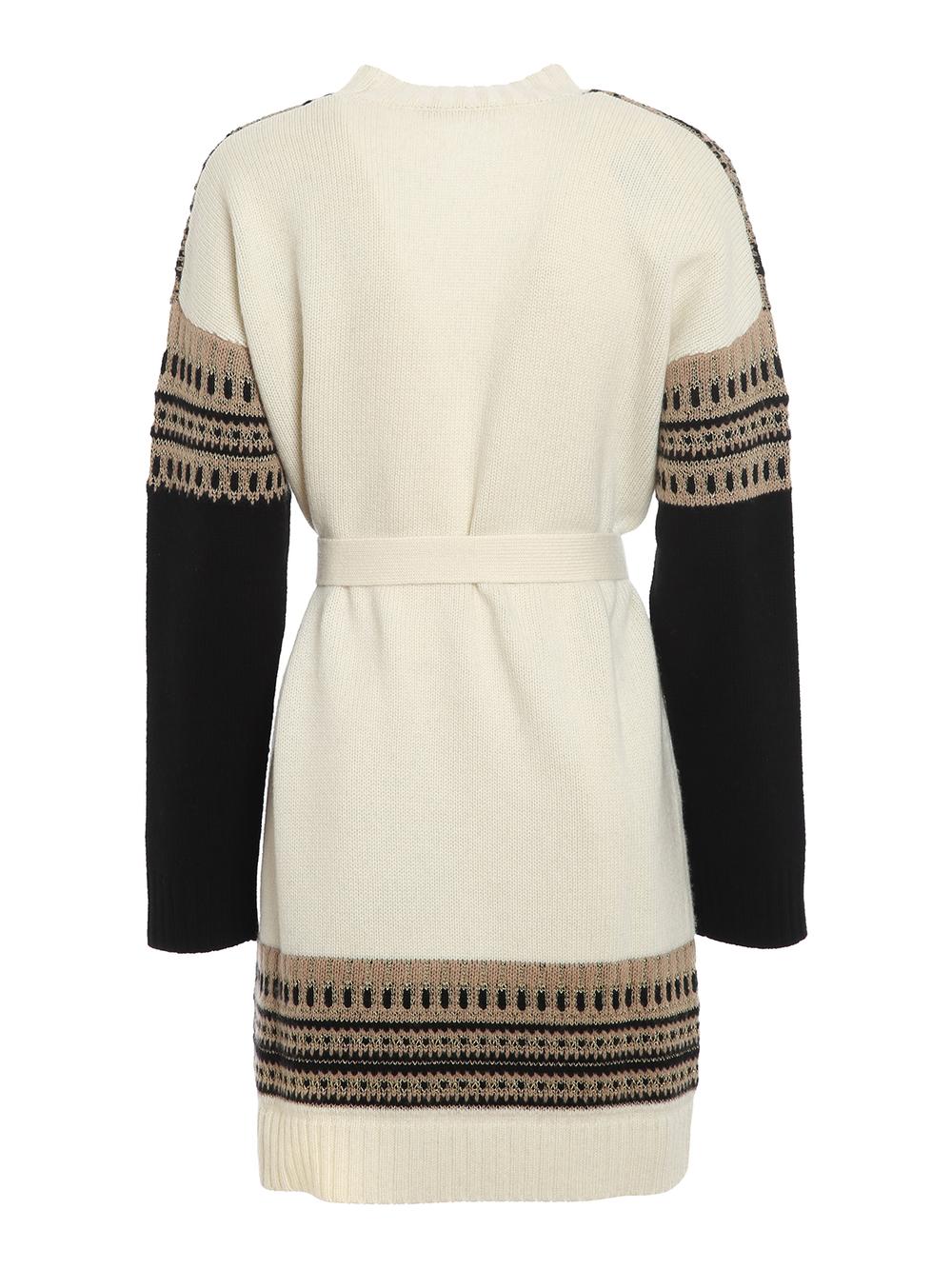 Maxi cardigan dal taglio dritto in filato di lana e cachemire color panna. Su fondo e spalle lavorazione jaquard a punto rasato beige e nero con inserti in filo di lurex oro. Manica a contrasto nera. Polsi e bordo a costina. Cintura tono su tono da poter annodare in vita.
