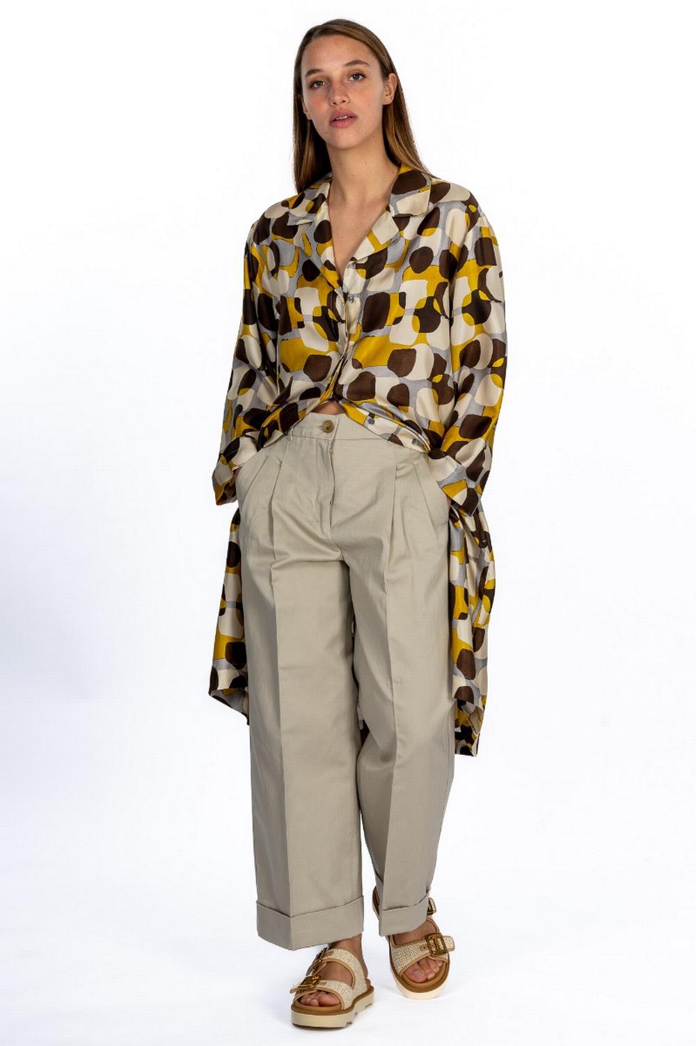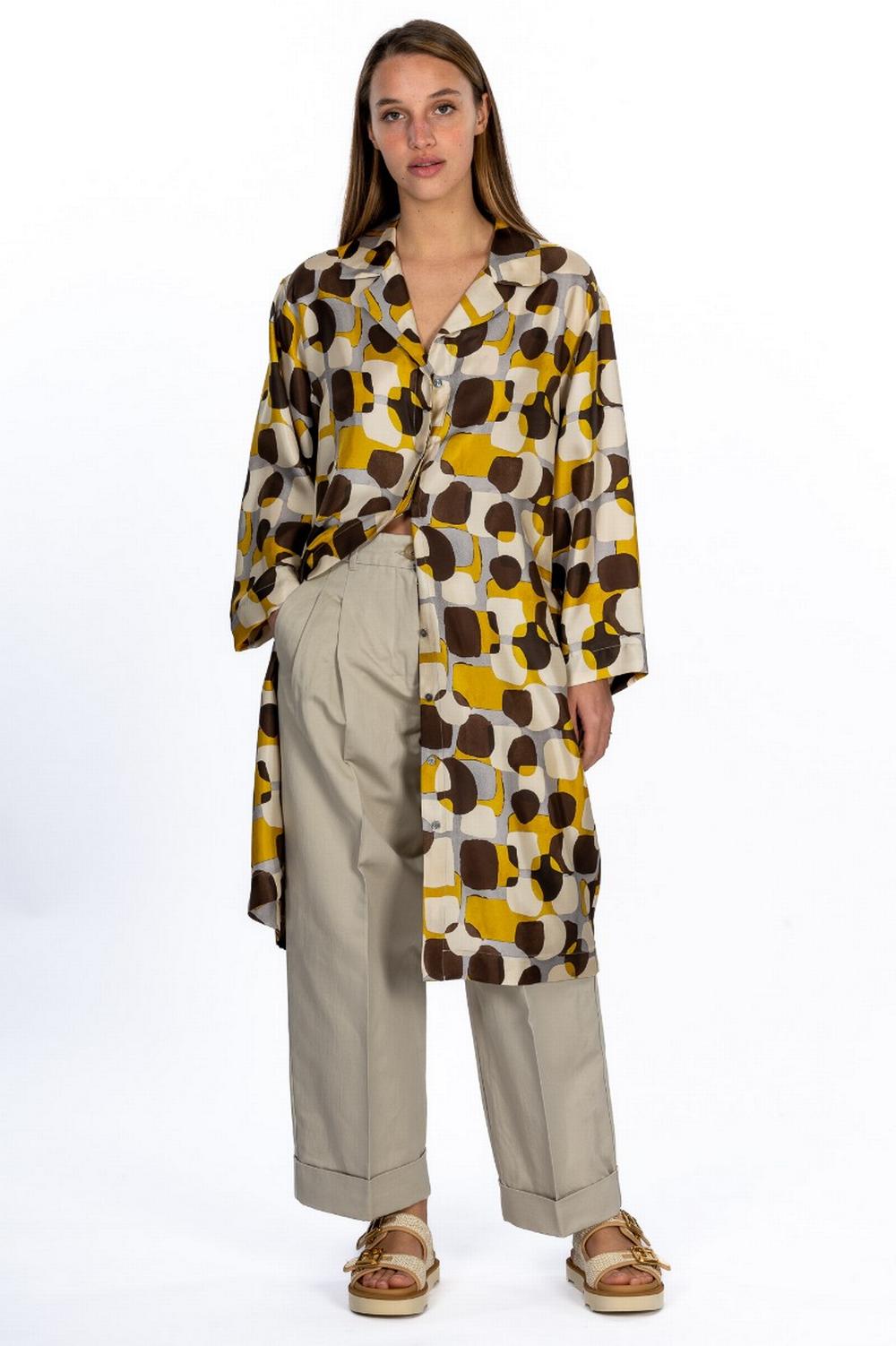 Abito kaftano in twill di seta con stampa geometrica sui toni del giallo. Scollo a V, maniche tre quarti ampie con spalla scesa. Chiusura con bottoni nascosti e cinturina abbinata da annodare.
