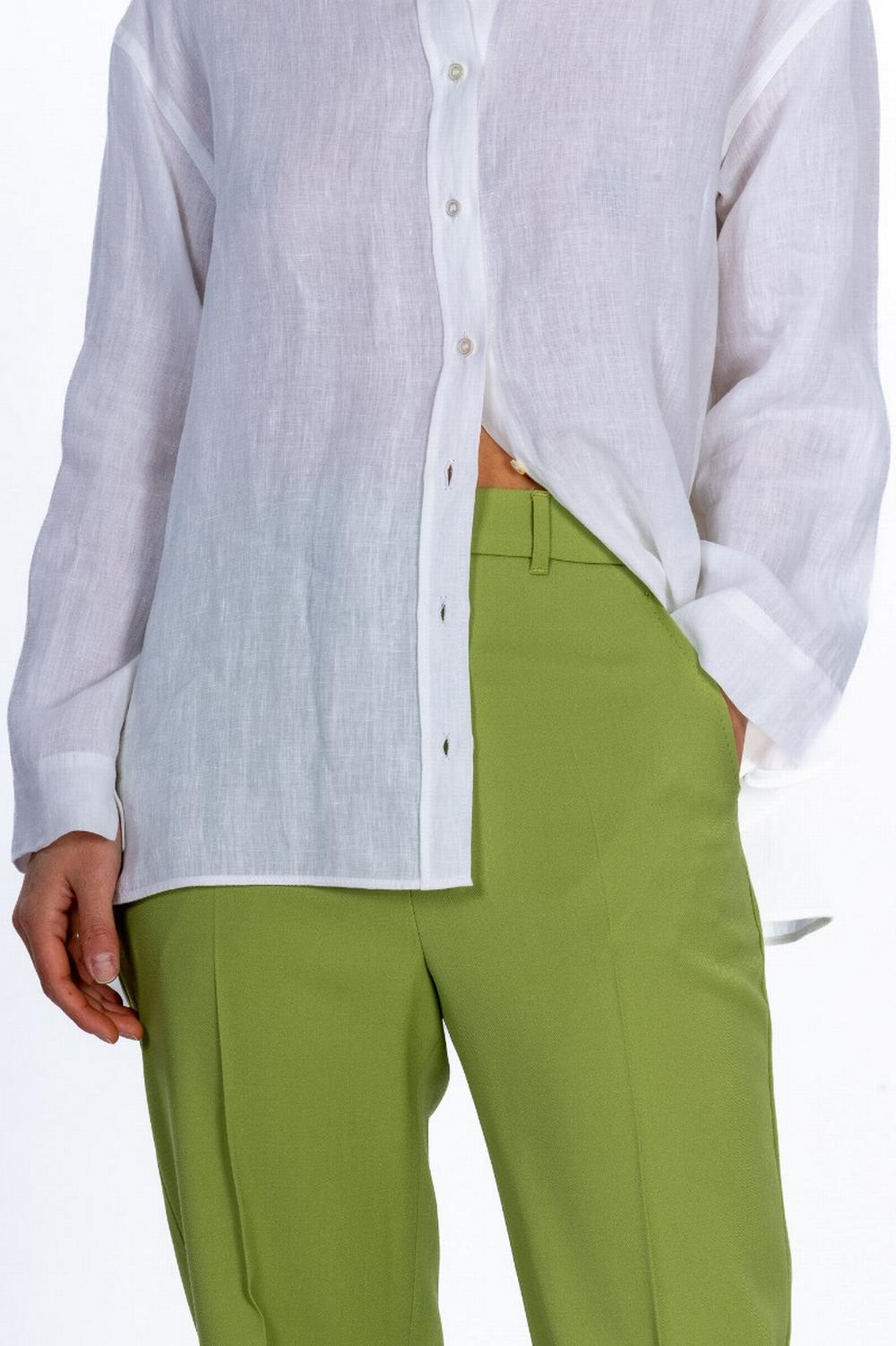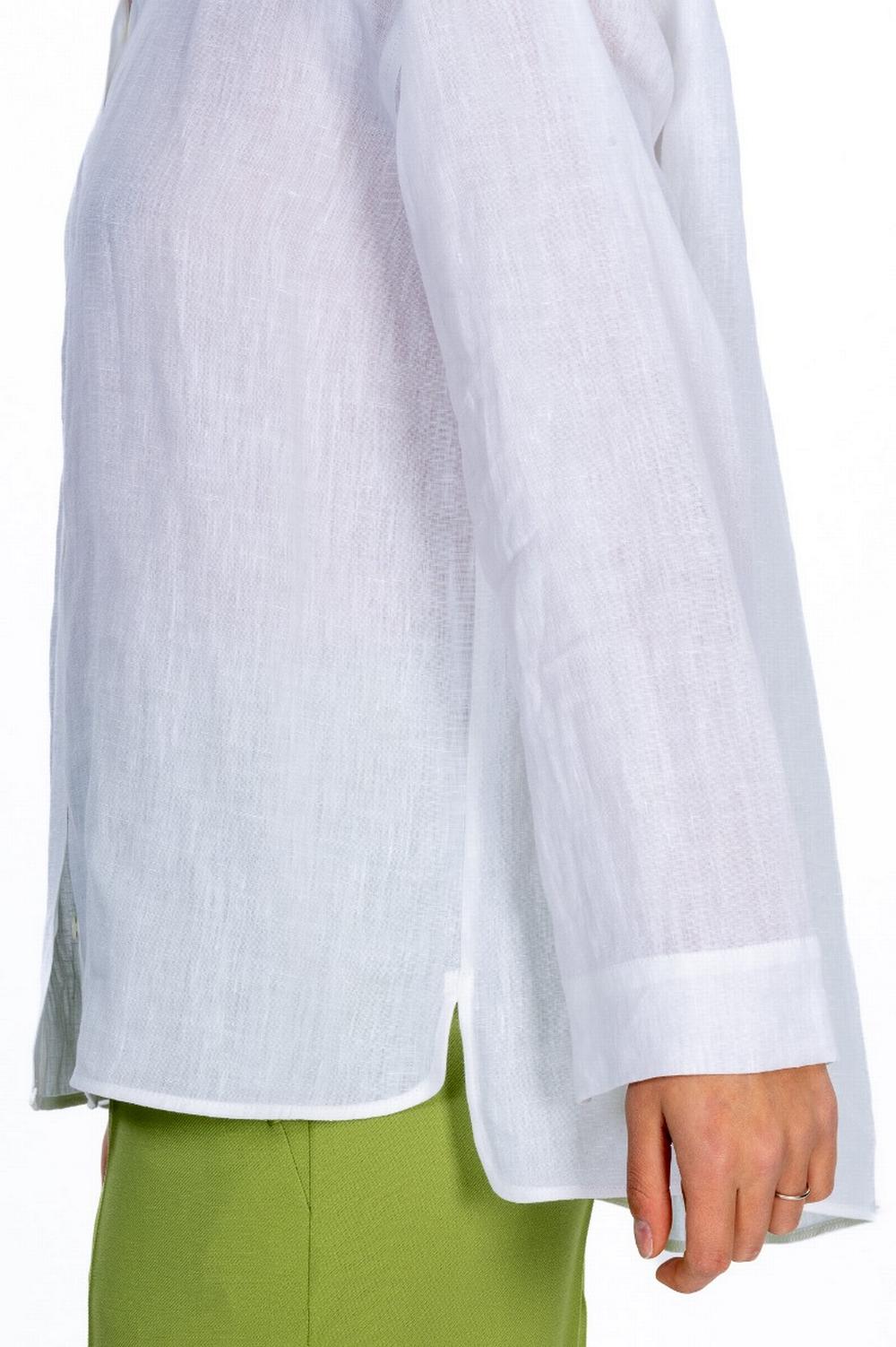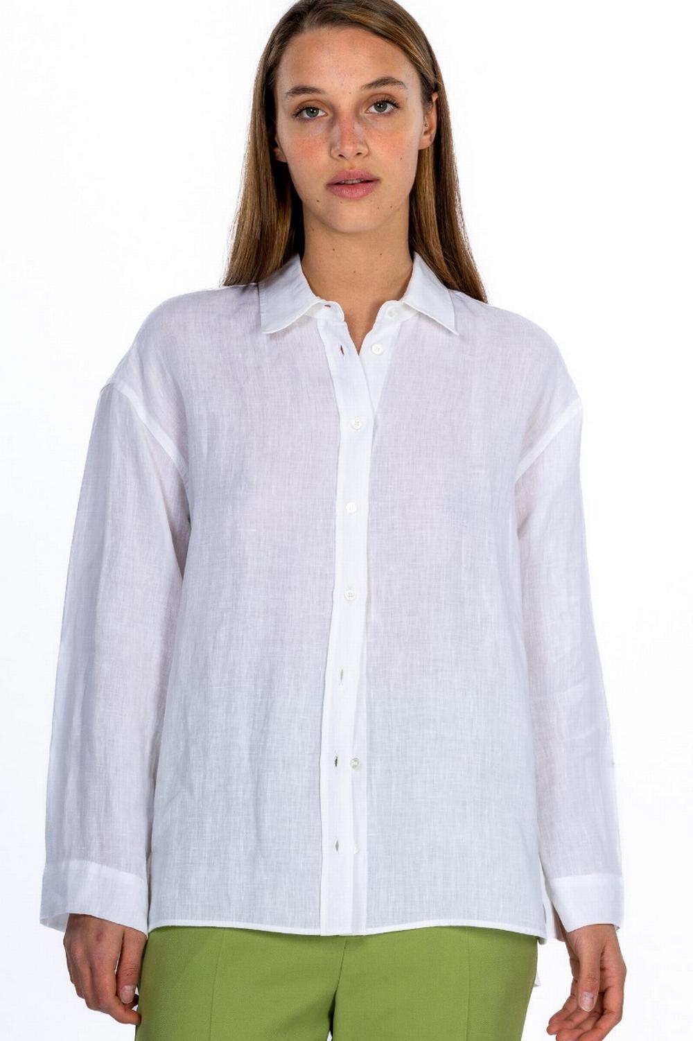 Camicia in chambray di lino bianco, dalla linea ampia. Colletto classico e contropiega centrale sul retro. Chiusura con bottoni. Maniche a sette ottavi. Spacchi laterali sul fondo e a fondo manica. Fondo più lungo sul retro.