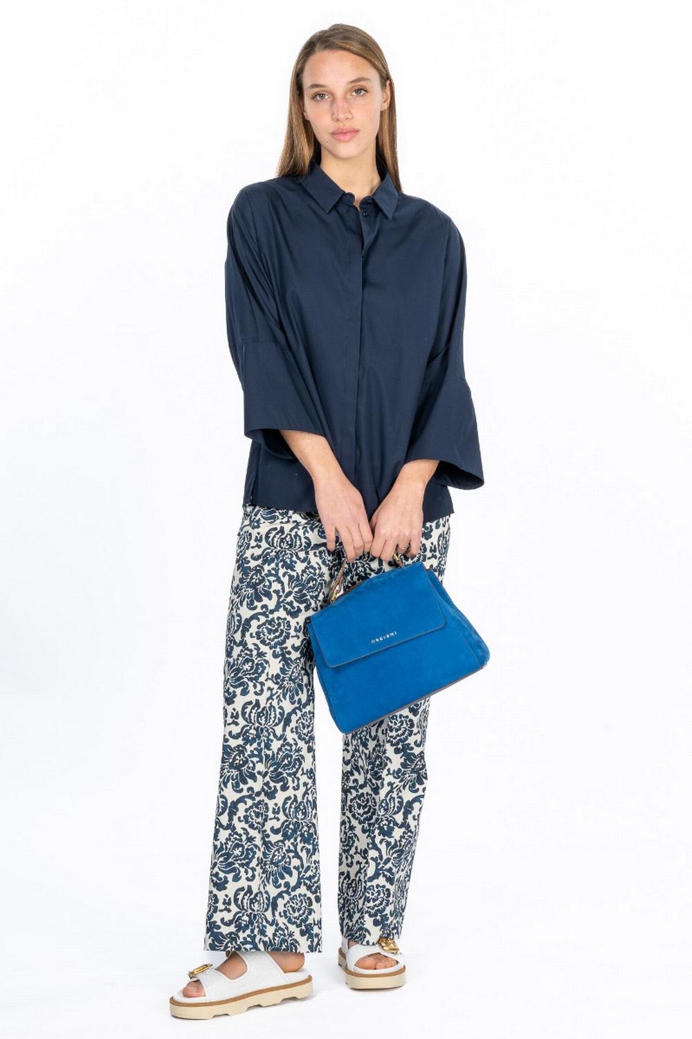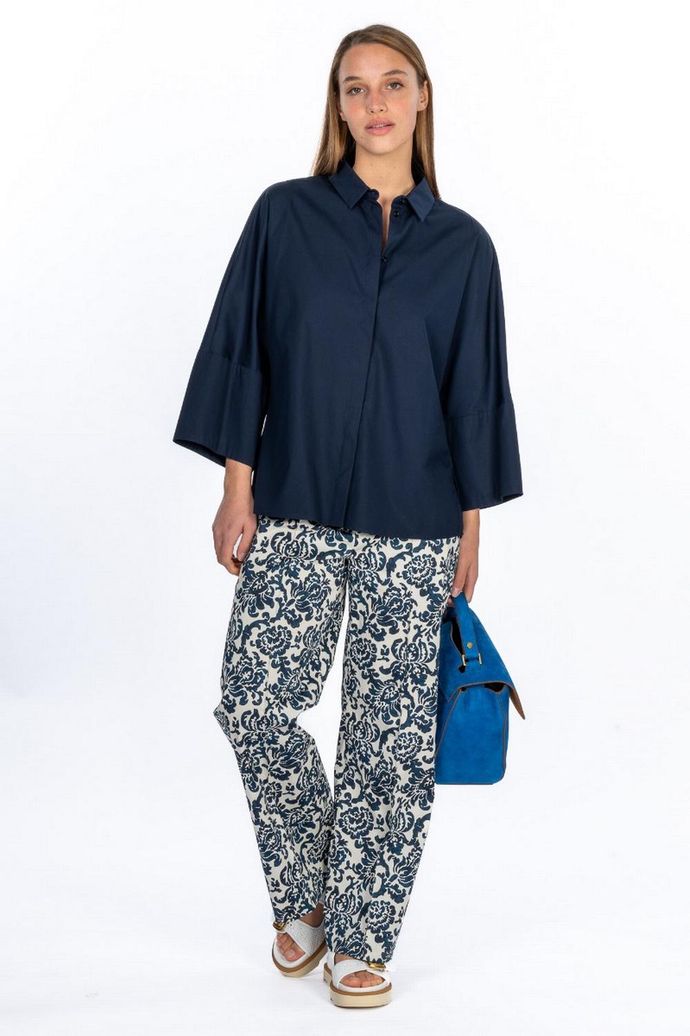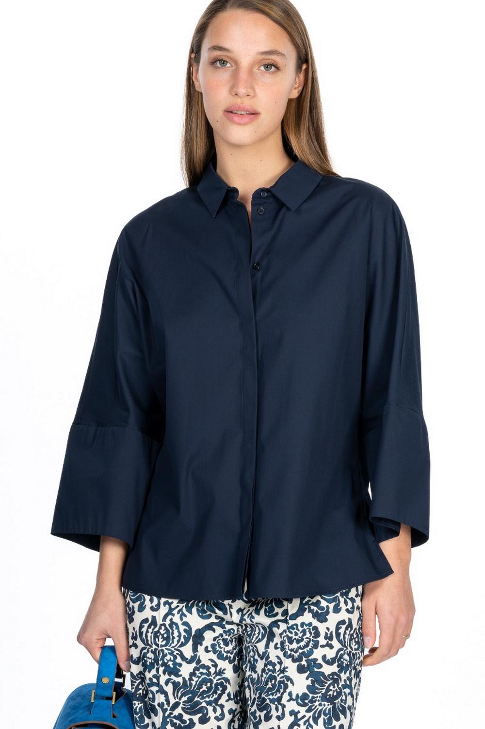Camicia in cotone blu navy, modello a chimono. Ampia , con manica a chimono tre quarti con cucitura alta. Chiusura con bottoni. Colletto classico. Sfondo piega sul retro. Spacchetti laterali sul fondo.