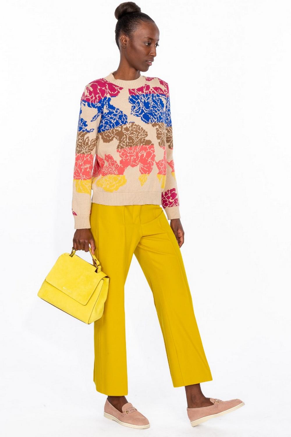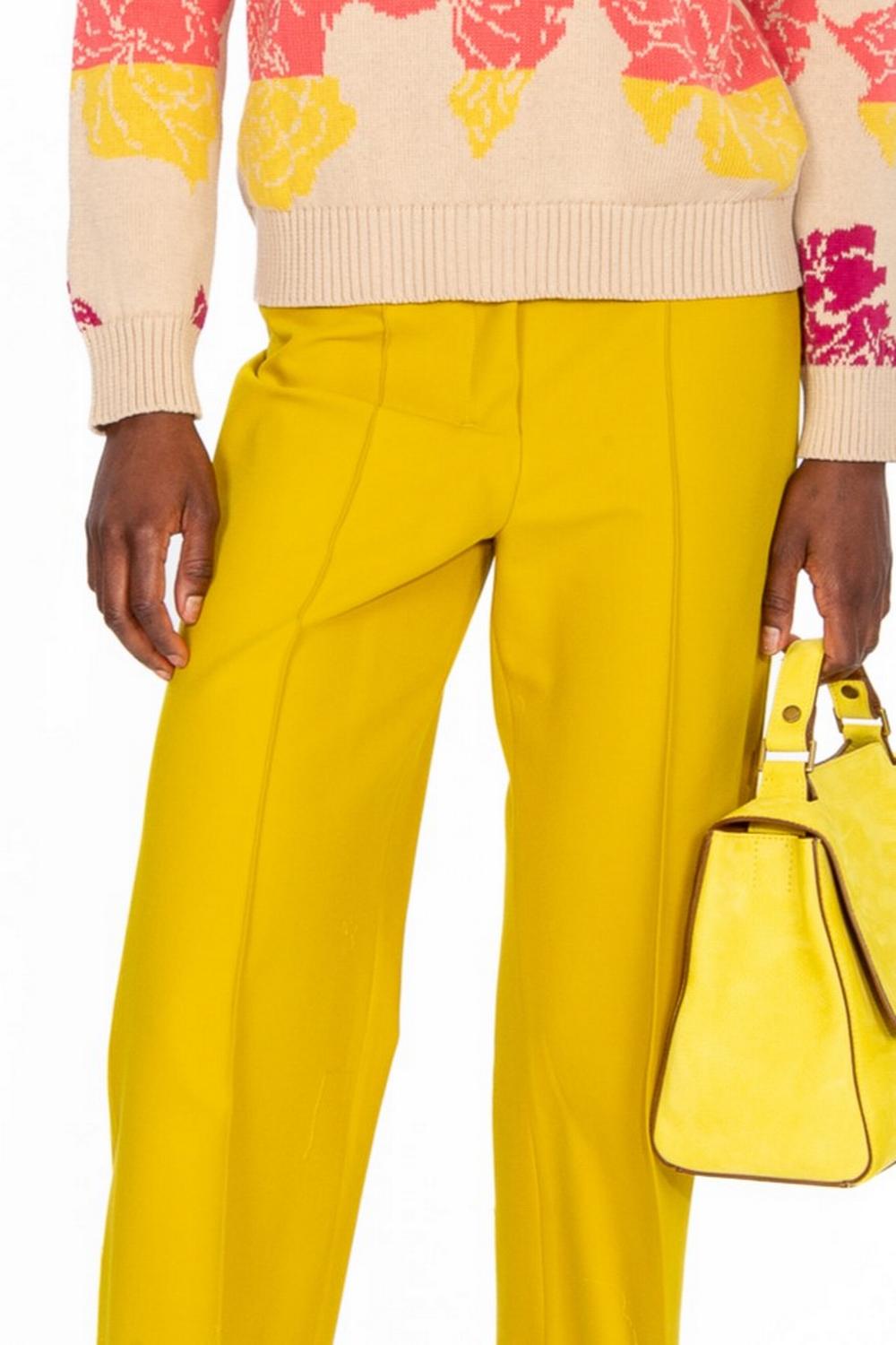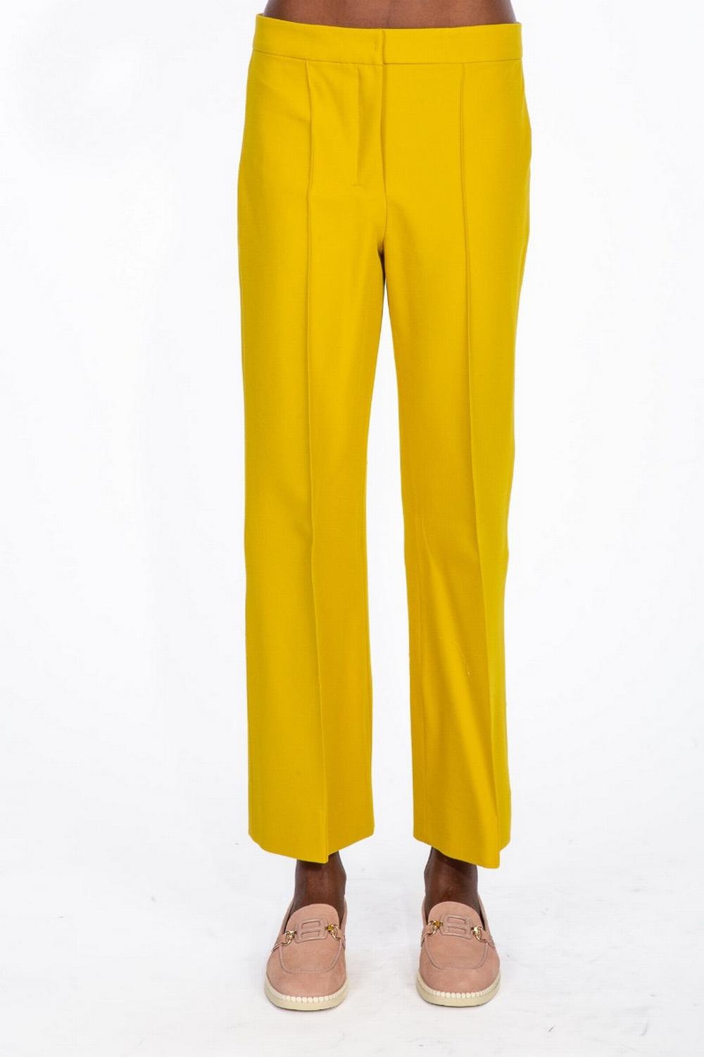 Pantalone in cotone e viscosa stretch color giallo senape. Gamba larga, lunghezza alla caviglia. Piega stirata sulla gamba con cucitura. Chiusura con zip coperta e gancetto.