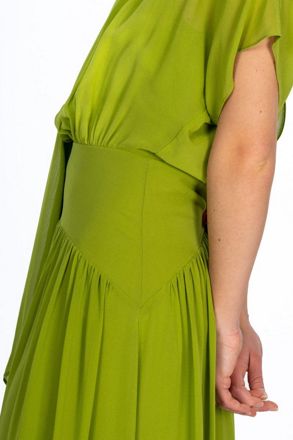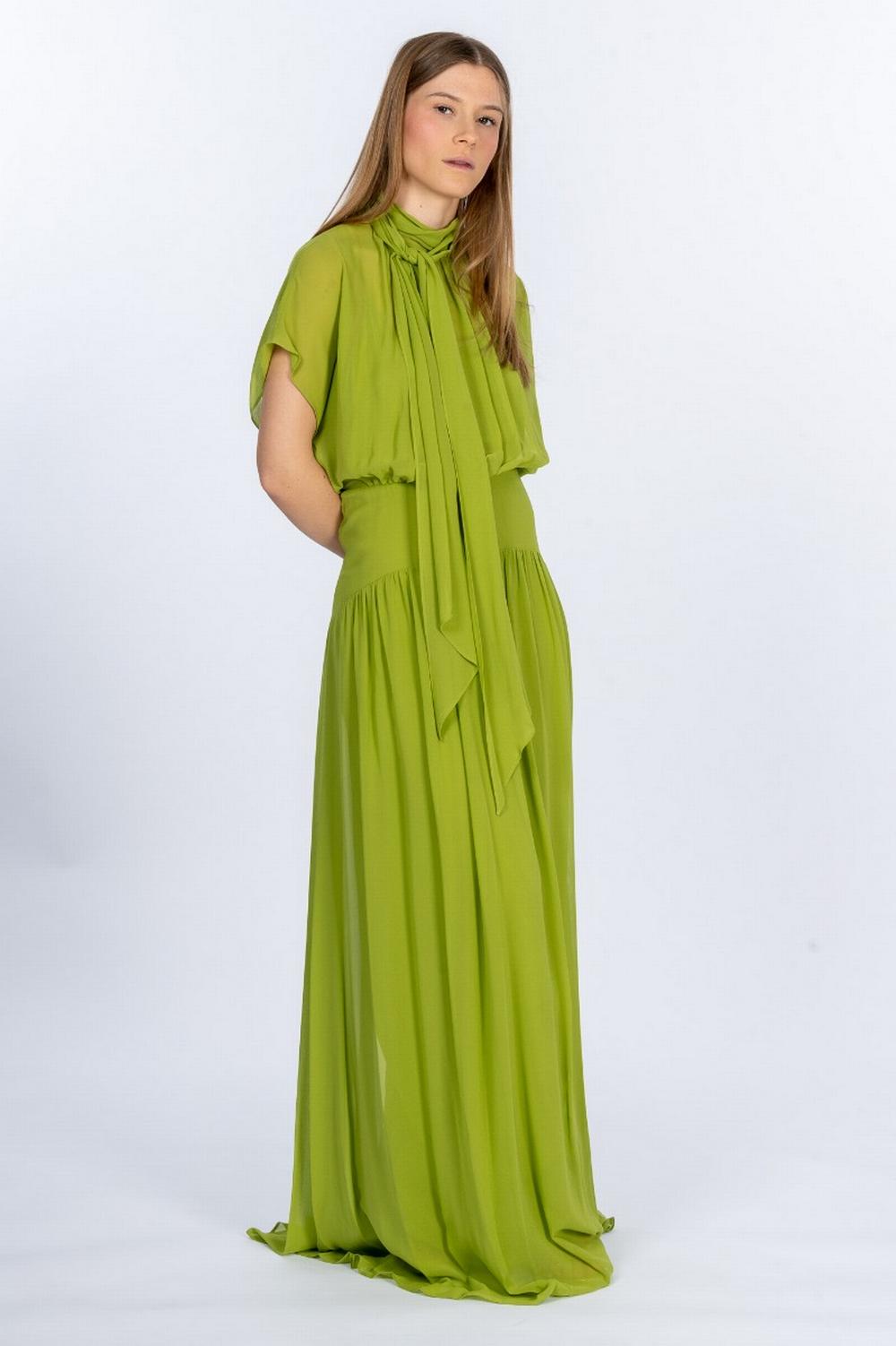 Abito lungo ed elegante in georgette di seta color verde kiwi. Collo alto con fusciacca da annodare. Scollo posteriore a V profondo. Maniche corte ad aletta. Corpetto con fascia in vita e arricciatura. Gonna fluida sui fianchi, lunga fino alla caviglia, con volume scivolato.