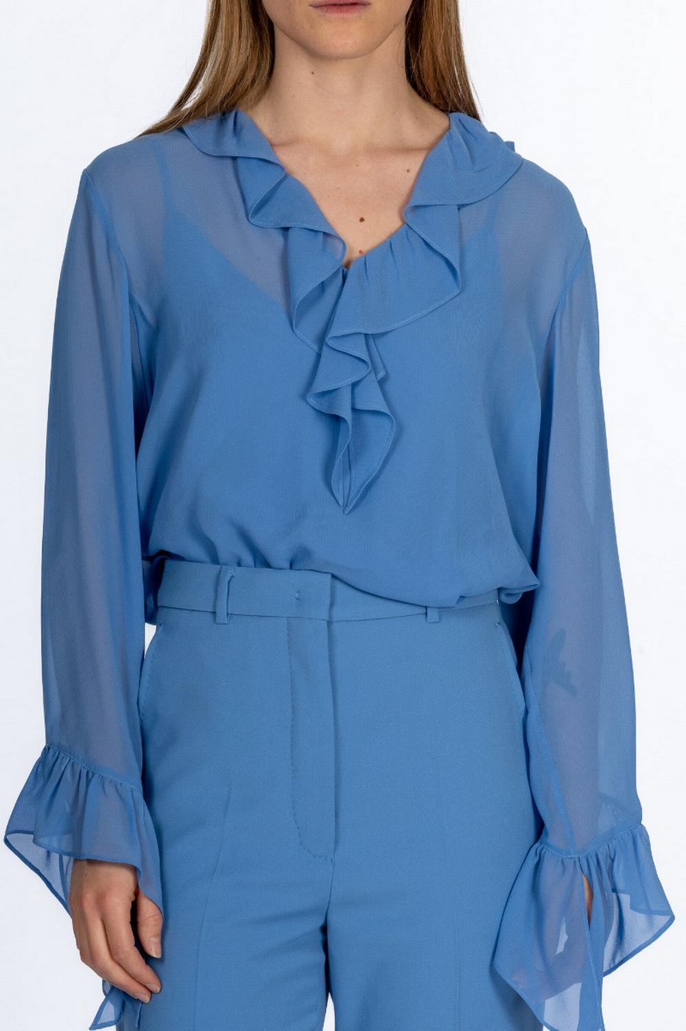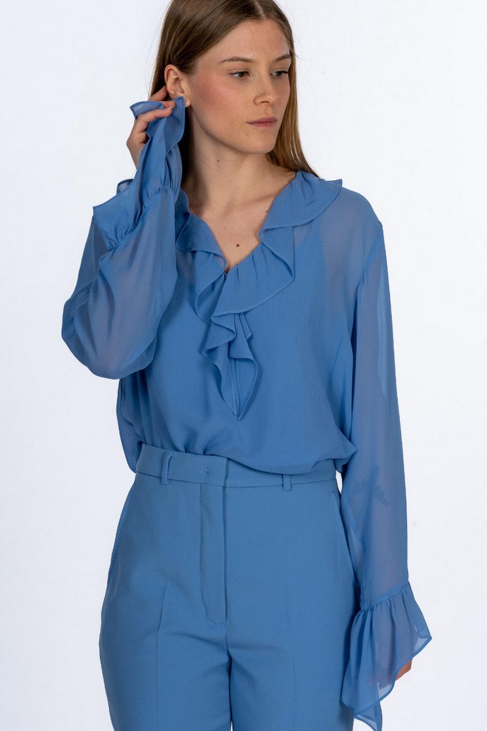 Blusa in georgette di pura seta color celeste. Linea morbida e fluida con scollo a V e volant sullo scollo. Maniche lunghe con fondo asimmetrico con volant. Top con spalline sottili abbinato.