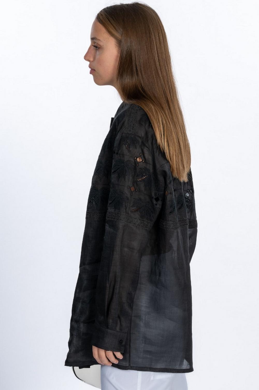 Camicia in puro ramiè nero, fibra tessile naturale pregiata. Ricami macramè a tema botanico sul fronte e sul retro. Linea morbida e chiusura con bottoni nascosti. Colletto ampio, maniche lunghe con spalla scesa. Polsini con bottoni.