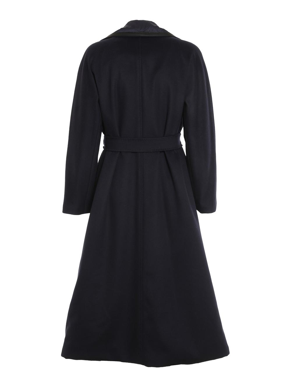 Cappotto lungo in lana blu. Reversibile, all'interno nylon opaco blu trapuntato a rombi. Imbottitura ecologica Luxepad in cashmere e poliestere che garantisce calore e comfort. Modello over a vestaglia, senza bottoni, con doppia cintura, in lana e in pelle. Collo con rever. Profili in pelle nera. Tasche inserite e applicate a contrasto. Linea 'S