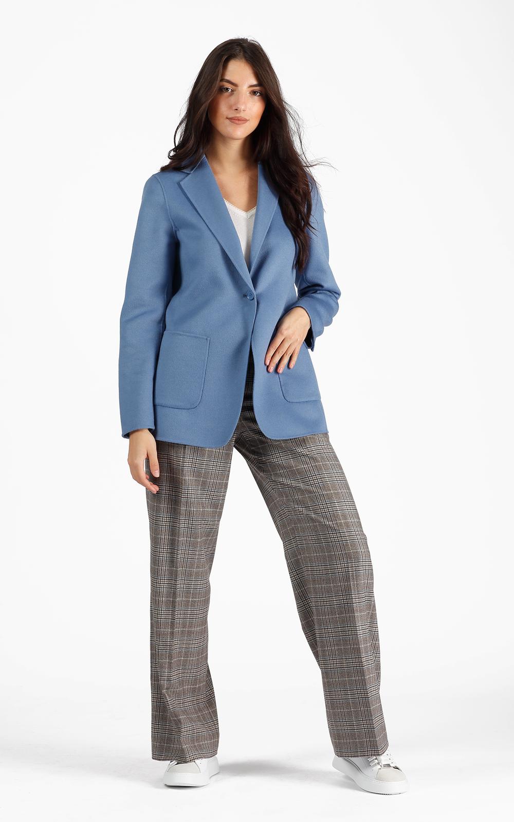 Blazer in pregiato tessuto di lana misto cashmere e seta, morbido e avvolgente. Color azzurro celeste. Collo con rever classico. Chiusura con un bottone. Tasche applicate. Spacchetti sulle maniche. Sfoderato. Linea dritta. Collezione Studio.