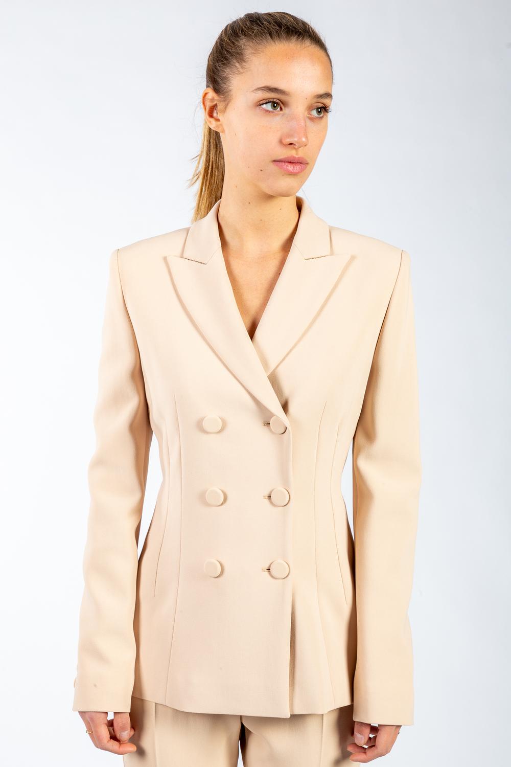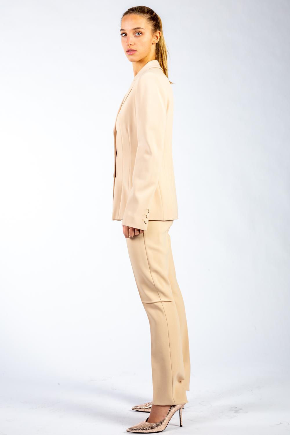 Giacca in twill di viscosa stretch colore nude. Chiusura doppiopetto con bottoni ricoperti. Collo con rever a lancia. Manica lunga con bottoni. Linea sagomata in vita con cuciture verticali. Foderata. Completo con pantalone Belfast.