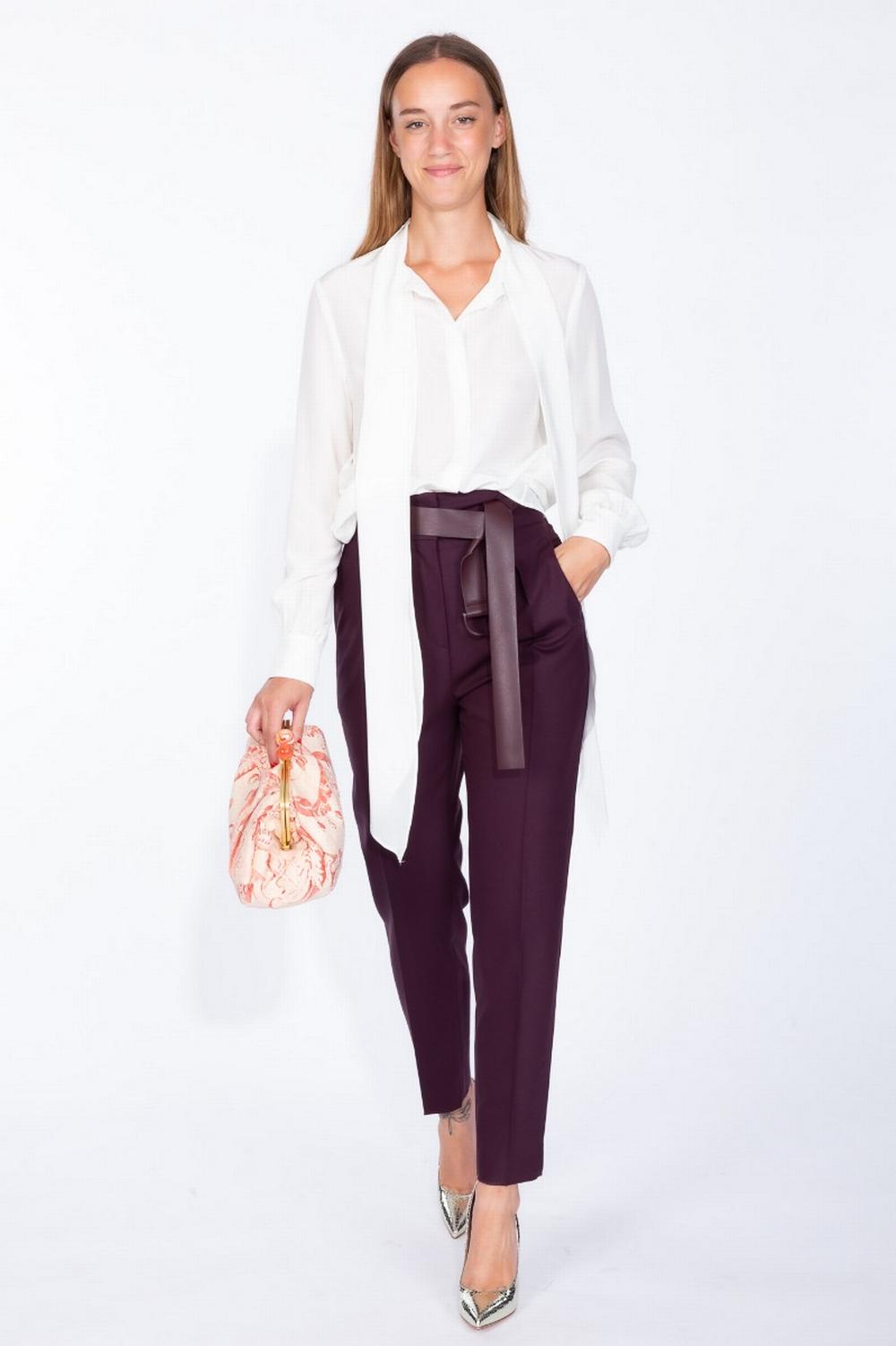 Pantalone in saglia di lana bordeaux a trama diagonale. Vita alta, con cintura in pelle abbinata. Linea carrot, morbido sulla coscia, a stringere sul fondo, con pince in vita e piega centrale stirata. Chiusura con zip e doppio gancetto nascosto. Tasche inserite lateralmente.
