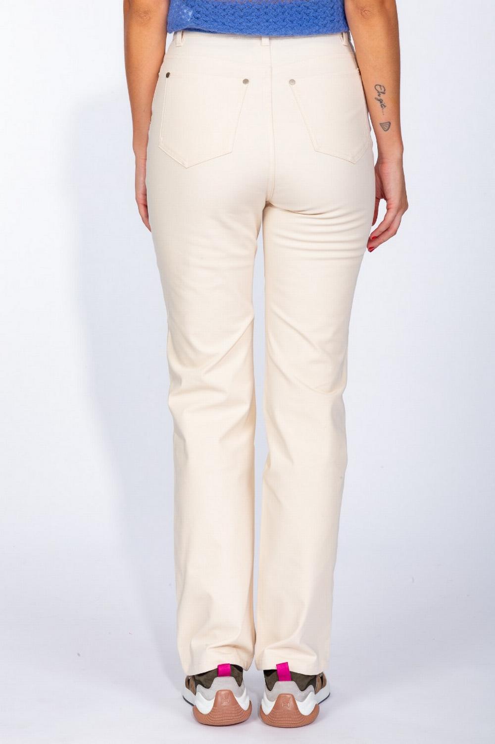 Pantalone in gabardina di cotone color crema. Cinque tasche, con vita alta, linea aderente sulla coscia e ampio sul fondo. Chiusura con zip e bottone in metallo.