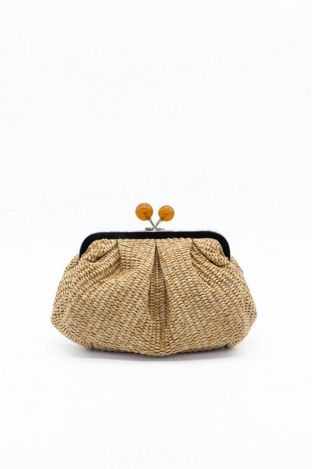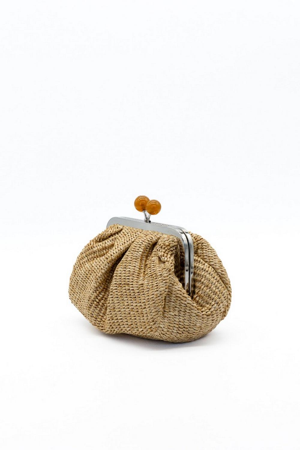 Borsa modello Pasticcino in misura mini. Realizzata in rafia di cotone color paglia, con interno foderato. Chiusura clutch in metallo silver con biglie in resina blu e logo farfalla impresso. Tracollina in catena, con spallaccio in pelle blu. Uso crossbody o a mano.