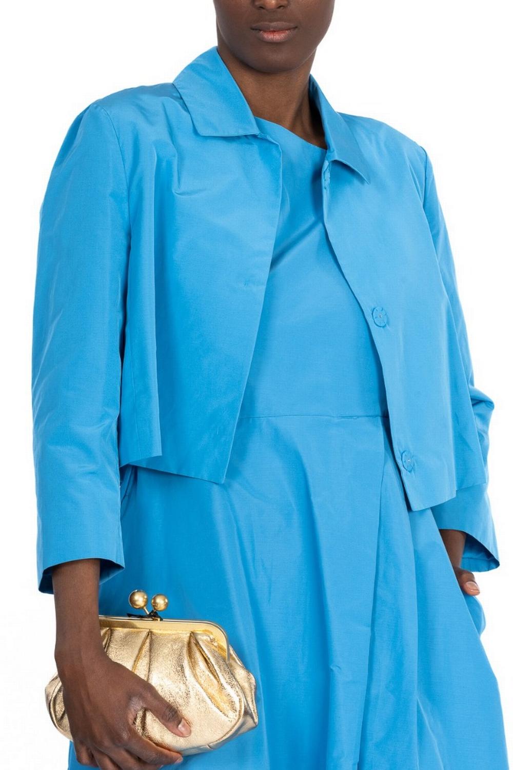 Giacca corta in taffetà misto cotone color turchese. Linea dritta e ampia sui fianchi. Colletto classico. Chiusura con bottoni a pressione nascosti. Maniche lunghe. Foderata.