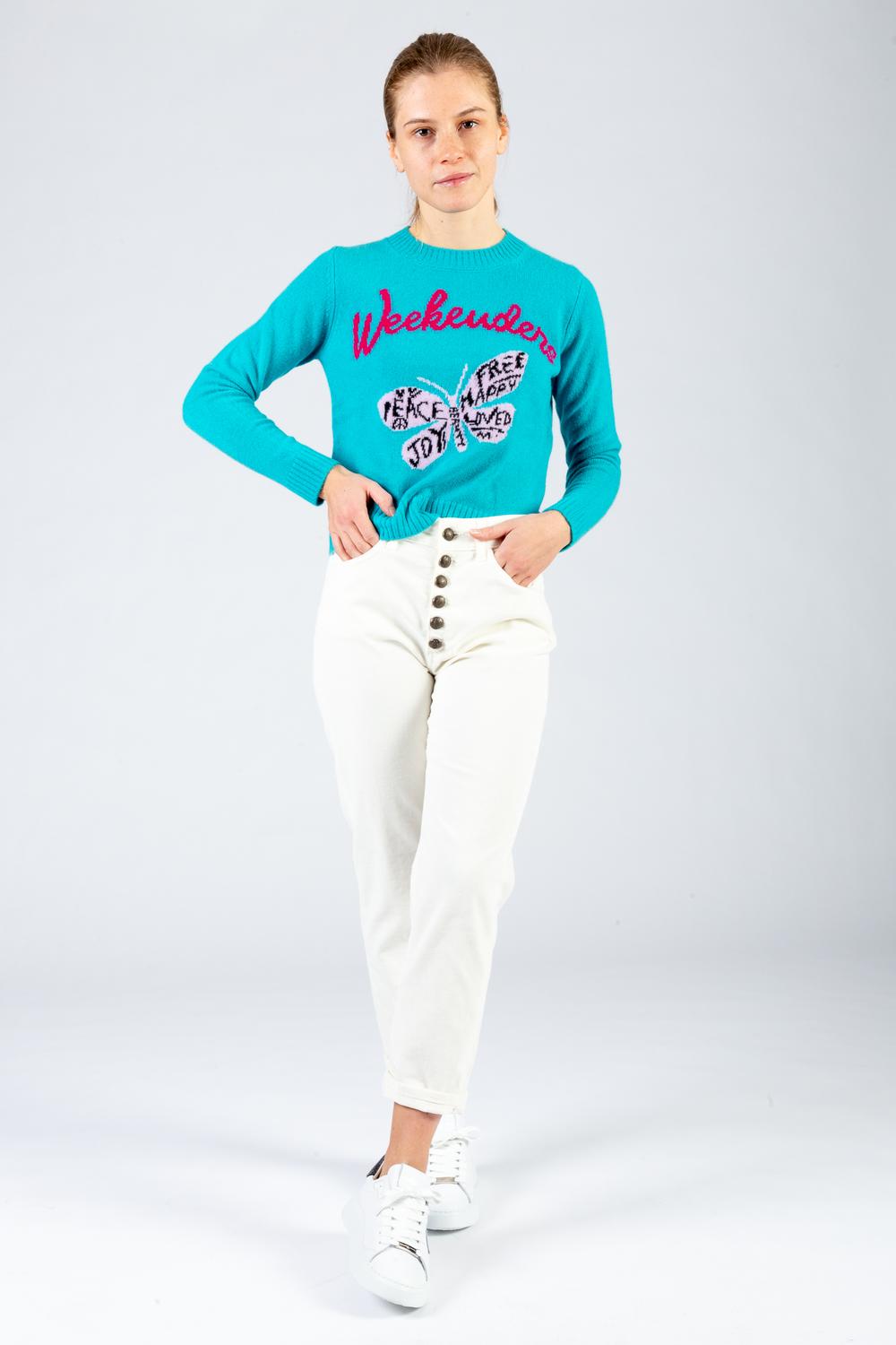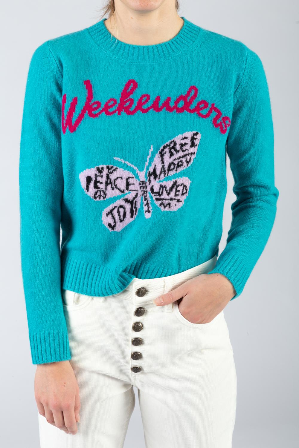 Maglia girocollo in cashmere verde. Linea a scatolina. Sul fronte ricamo farfalla rosa e scritta Weekenders fucsia.