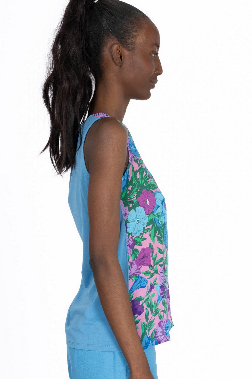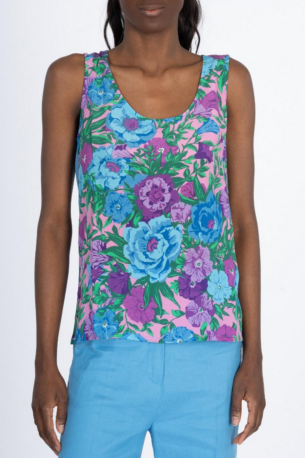 Canottina senza maniche in seta stampa floreale sui toni del turchese sul fronte, e retro in jersey misto cotone. Scolo tondo. Linea morbida.