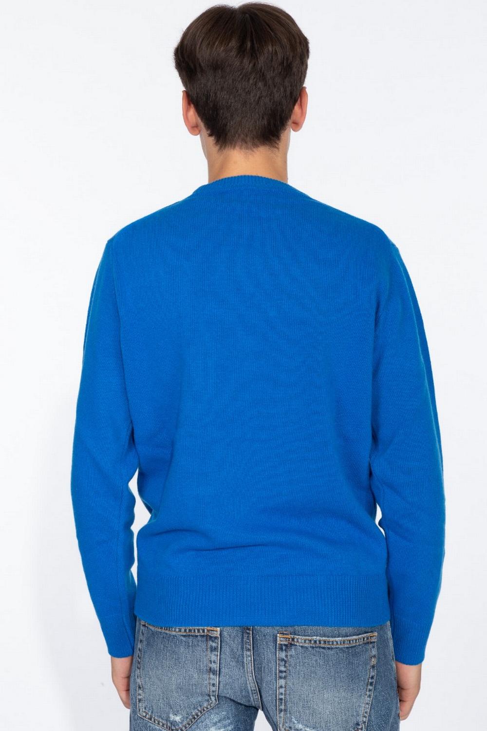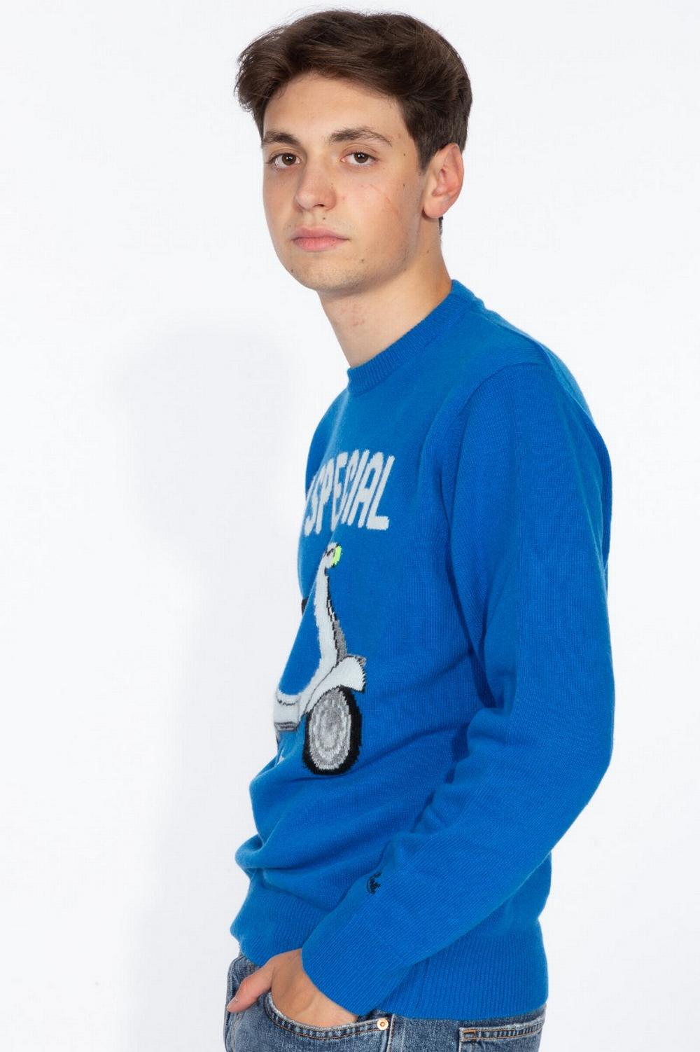 Maglione in morbido filato di misto lana e cashmere di blu elettrico a punto pannocchia. Ricamo 50 Special bianco sul petto e Vespa bianca. Collo, polsi e fondo a costine. Logo ricamato sul polso sinistro, blu.