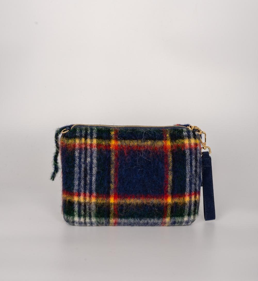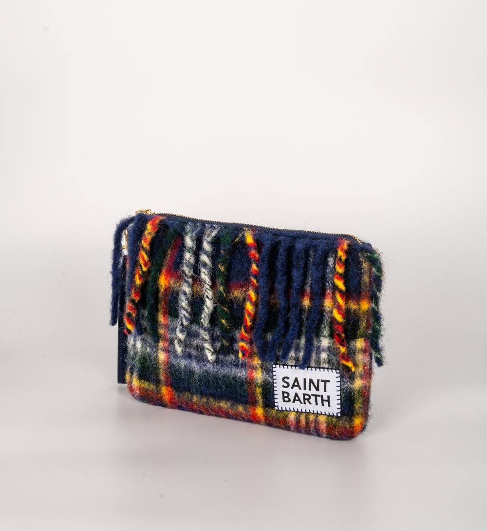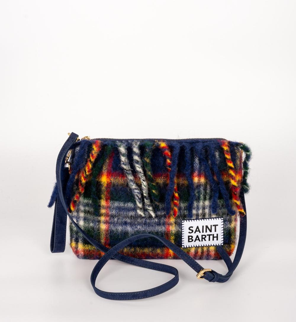 Pochette in lana misto alpaca effetto coperta, sui toni del blu e verde. Frange applicate sul fronte. Chiusura superiore con zip. Fornita di tracolla removibile per uso crossbody e di polsiera per uso a mano, in ecopelle scamosciata blu. Applicazione frontale di etichetta con logo. Interno in velluto. Dettagli in metallo dorato.