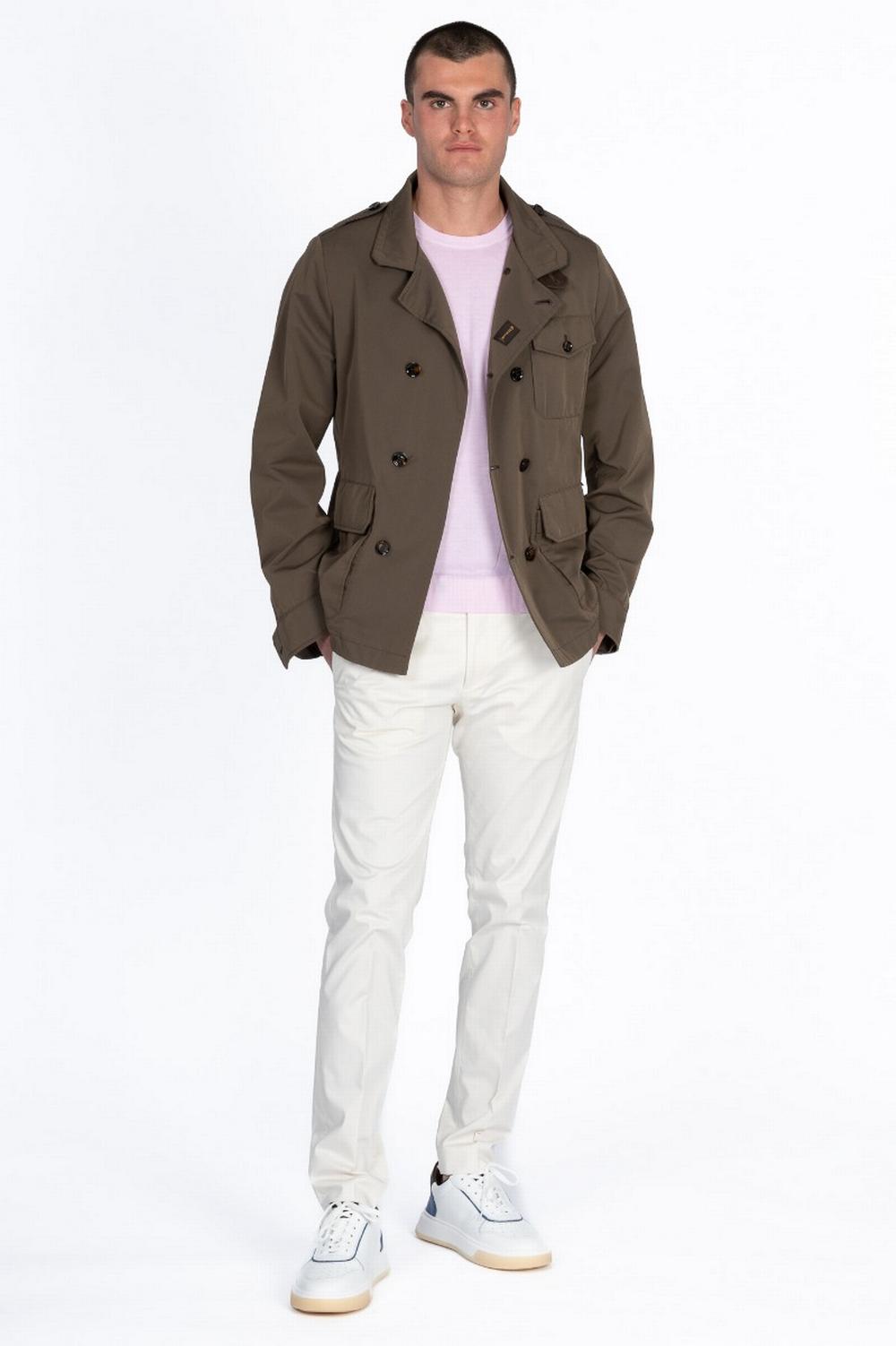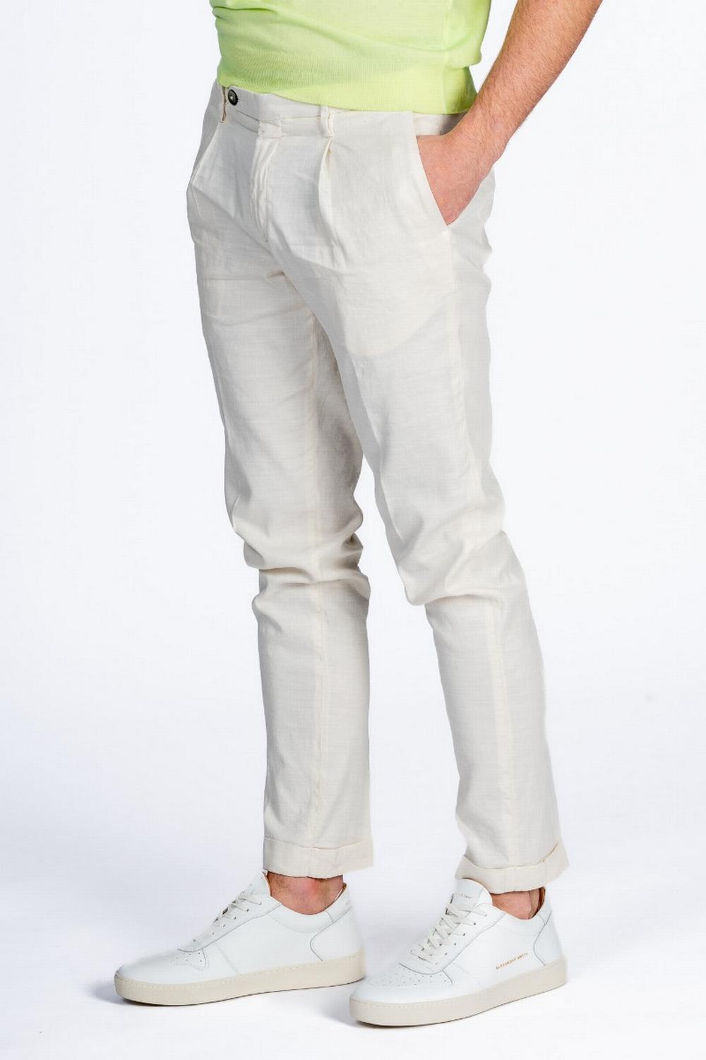 Pantalone dallo stile formale, in cotone stretch color avorio. Linea slim. Tasche america e e filetto sul retro. Chiusura con zip e bottone spostato. Piega centrale stirata. Fondo con cucitura alta.
