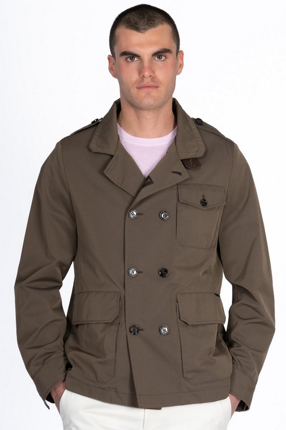 Giacca saariana in gabardina di nylon e cotone color marrone castoro. Chiusura doppiopetto. Due tasche sul fronte e una sul petto, tutte applicate e con patta di chiusura. Alamari sulle spalle. Collo con alamaro e fascetta scamosciata. Interno con due tasche.