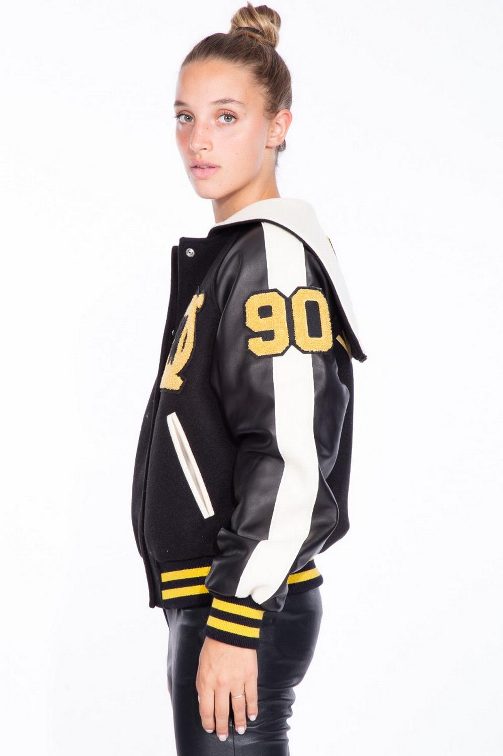 Giubbino di ispirazione College americani in tessuto misto mano panno lana di colore nero. Toppe decorative color giallo oro applicate sul petto, sulla manica e sul retro. Due tasche inserite con filetto a contrasto bianco. Maniche in finta pelle di colore nero con banda bianca centrale. Collo ampio che scende sul retro a contrasto bianco e che si può trasformare in cappuccio. Leggera imbottitura interna trapuntata. Polsi e fondo elasticizzati.