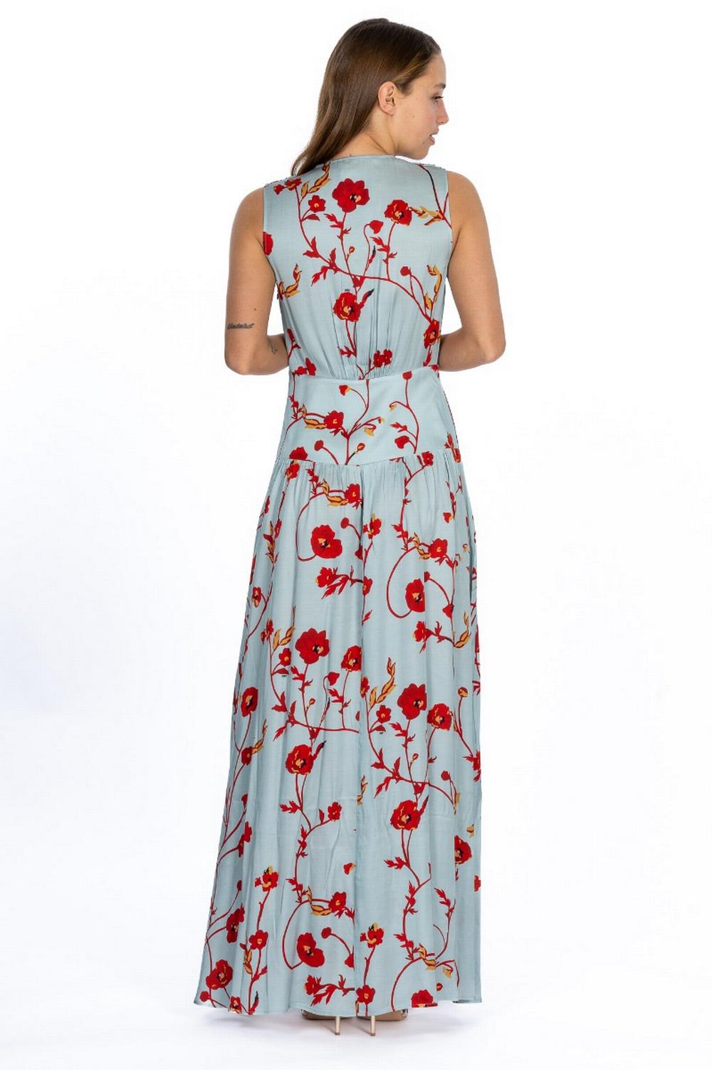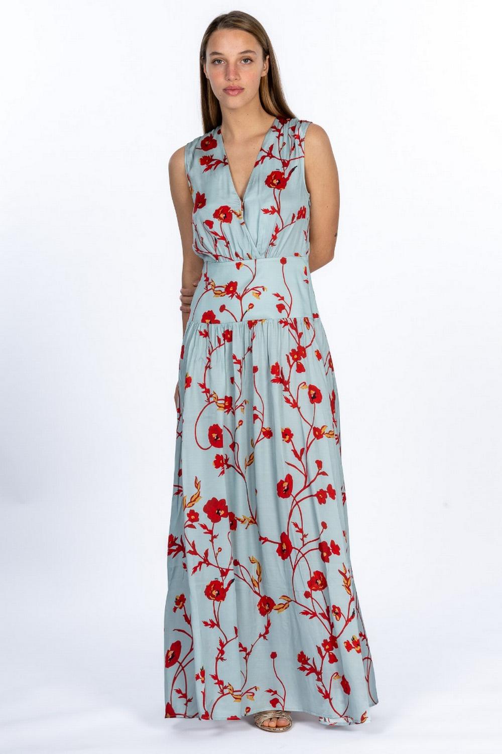 Abito lungo in viscosa setificata color azzurro acqua, con stampa fiori rossi. Scollo a V profondo con incrocio. Senza maniche con spalla larga. Fascia alta in vita. Gonna lunga con cucitura arricciata.