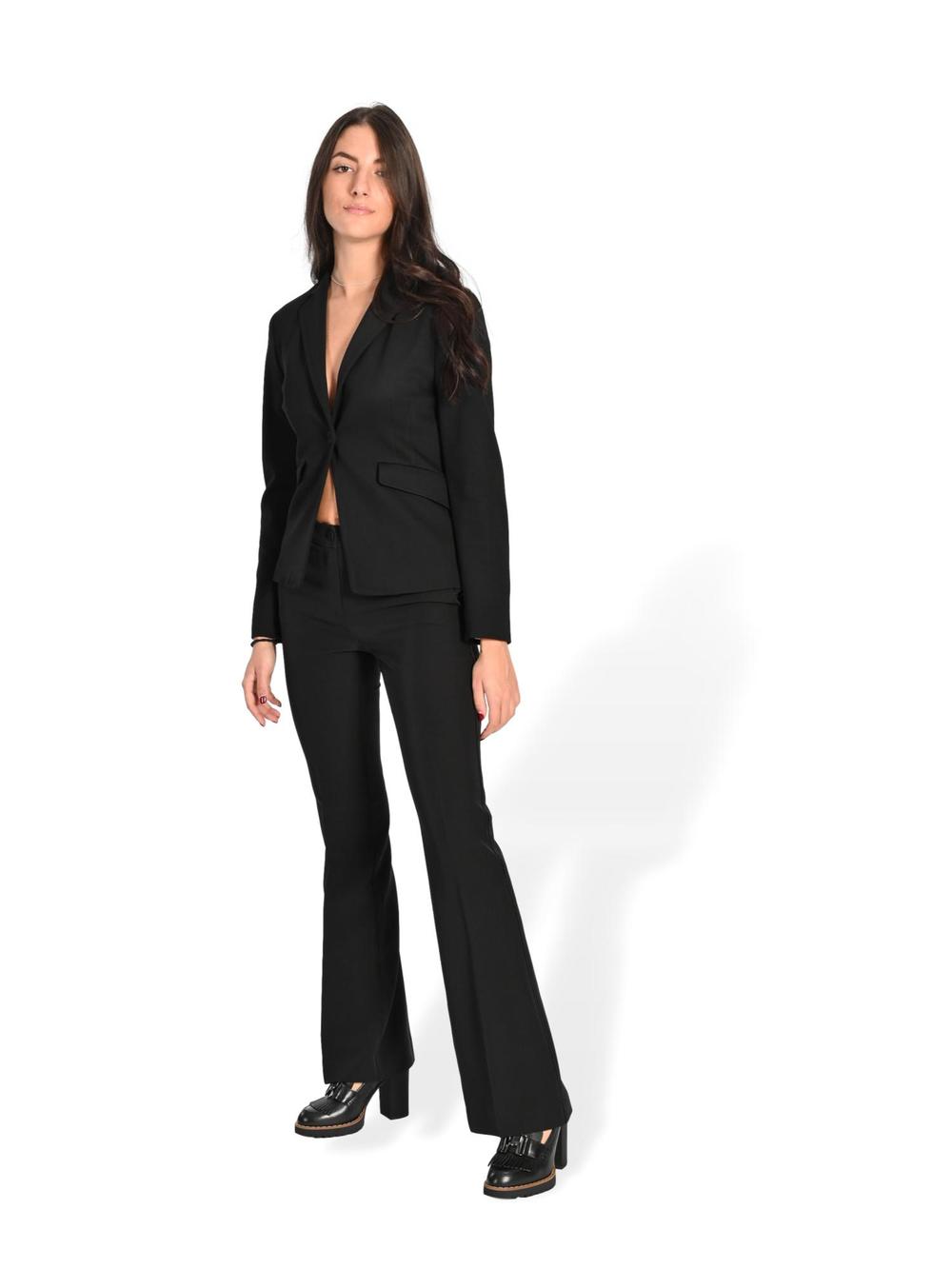 Giacca monopetto a un bottone, in tessuto nero stretch punto Milano. Collo con rever piccolo. Tasche con pattina diagonale. Sciancrata in vita. Fodera interna rosa chiaro.