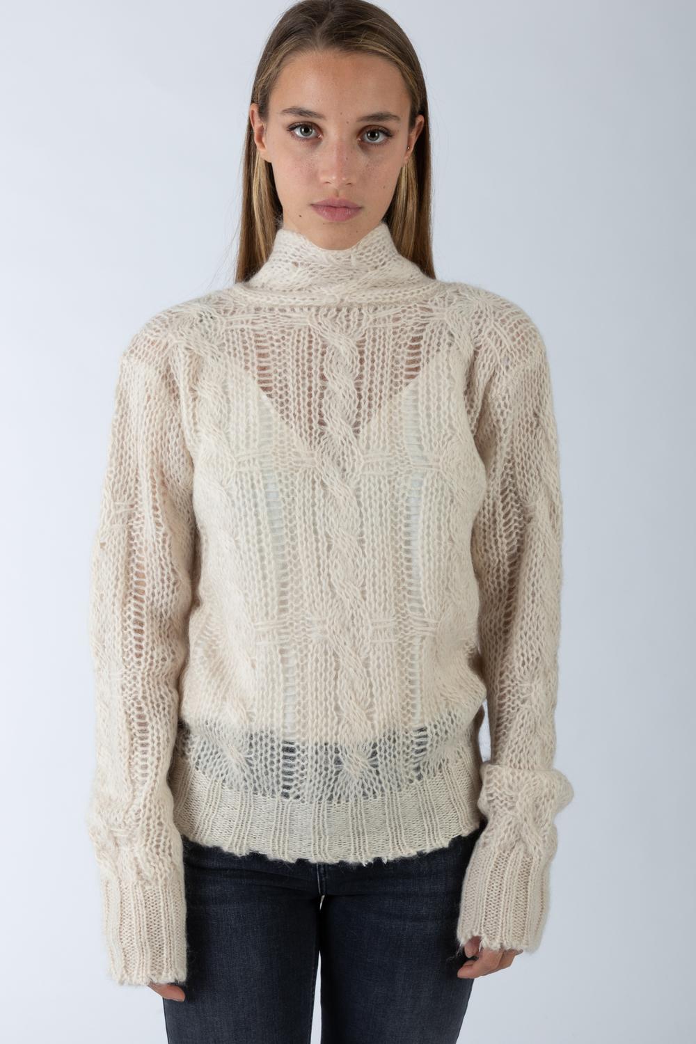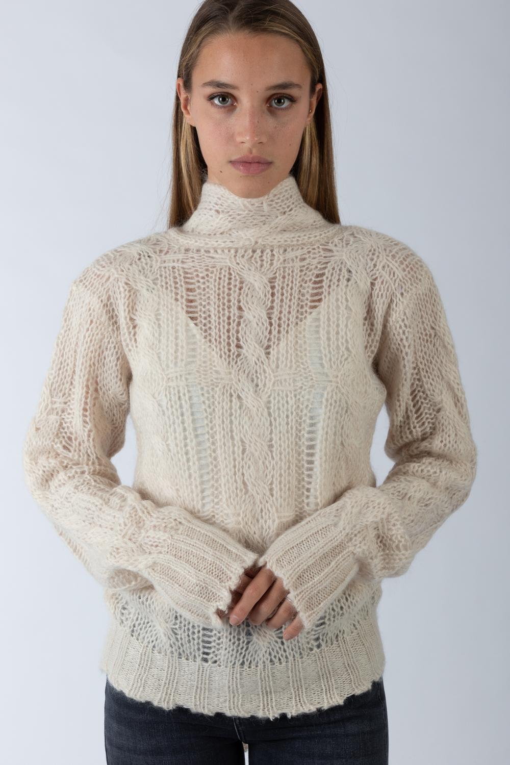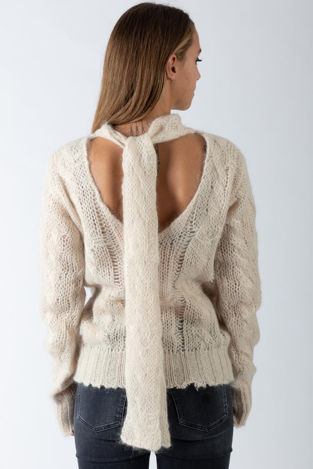 Maglione in morbida lana mohair color ecrù, lavorata a trecce a maglia larga. Collo alto sul fronte, da annodare sul retro. Particolare scollo a V sul retro, con sciarpina. Fondo e polsi a coste.