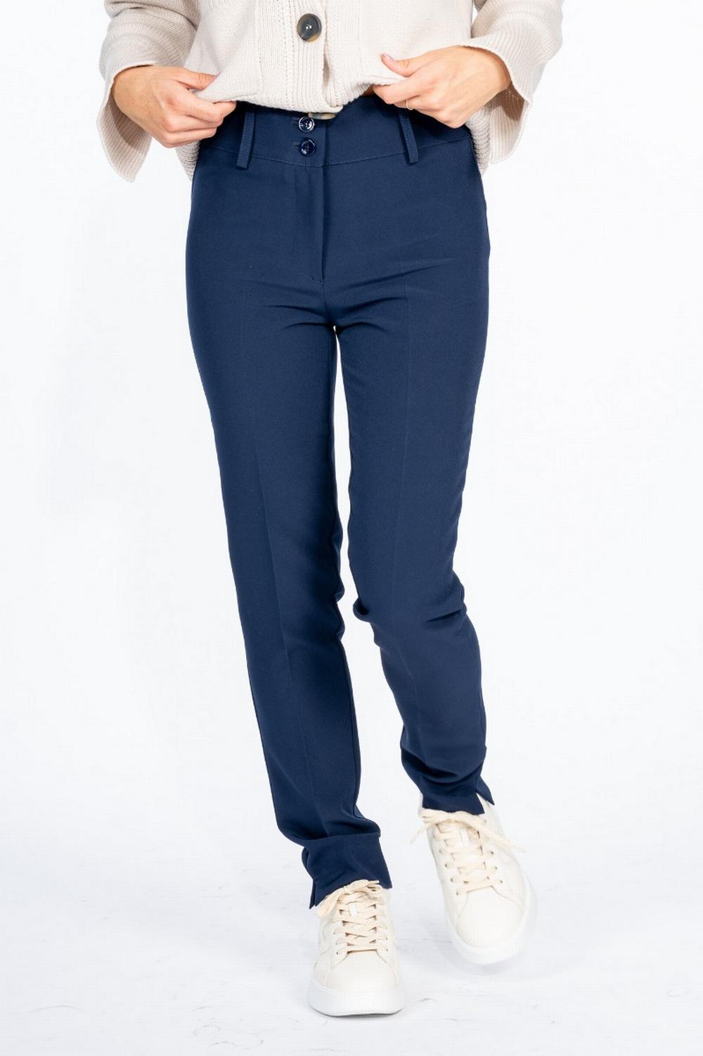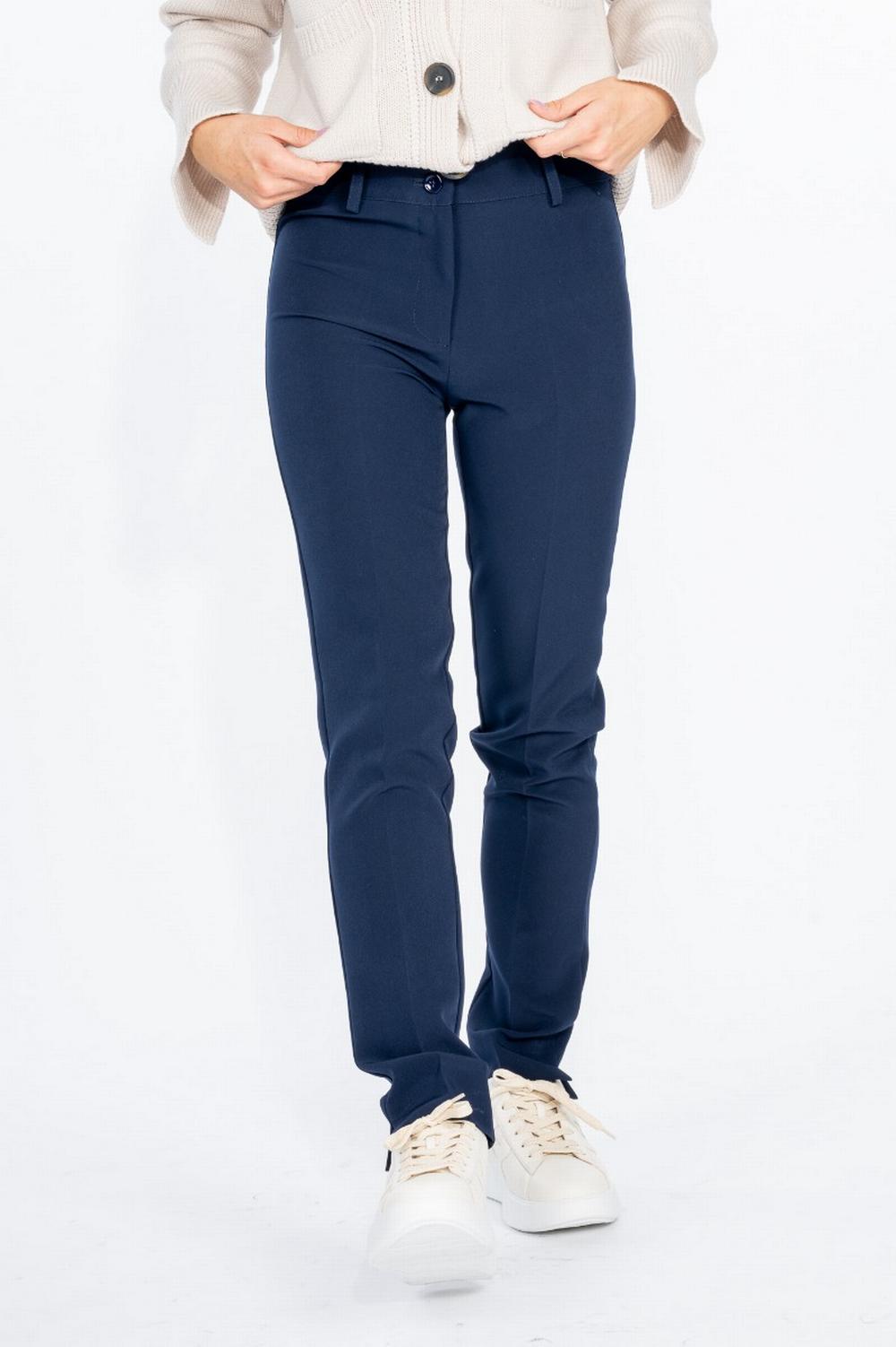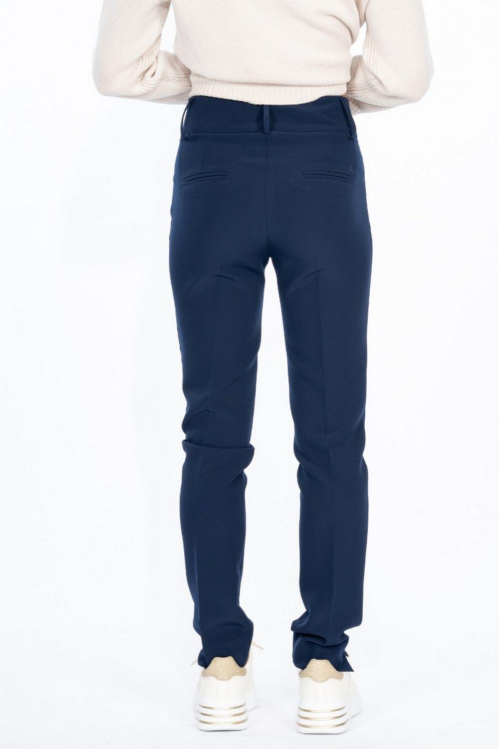 Pantalone in tessuto tecnico stretch blu aperto. Vestibilità aderente. Spacchetto sul fondo. Vita alta con chiusura zip e doppi bottoni. Passanti per cintura alta. Tasche posteriori decorative a doppio filetto.