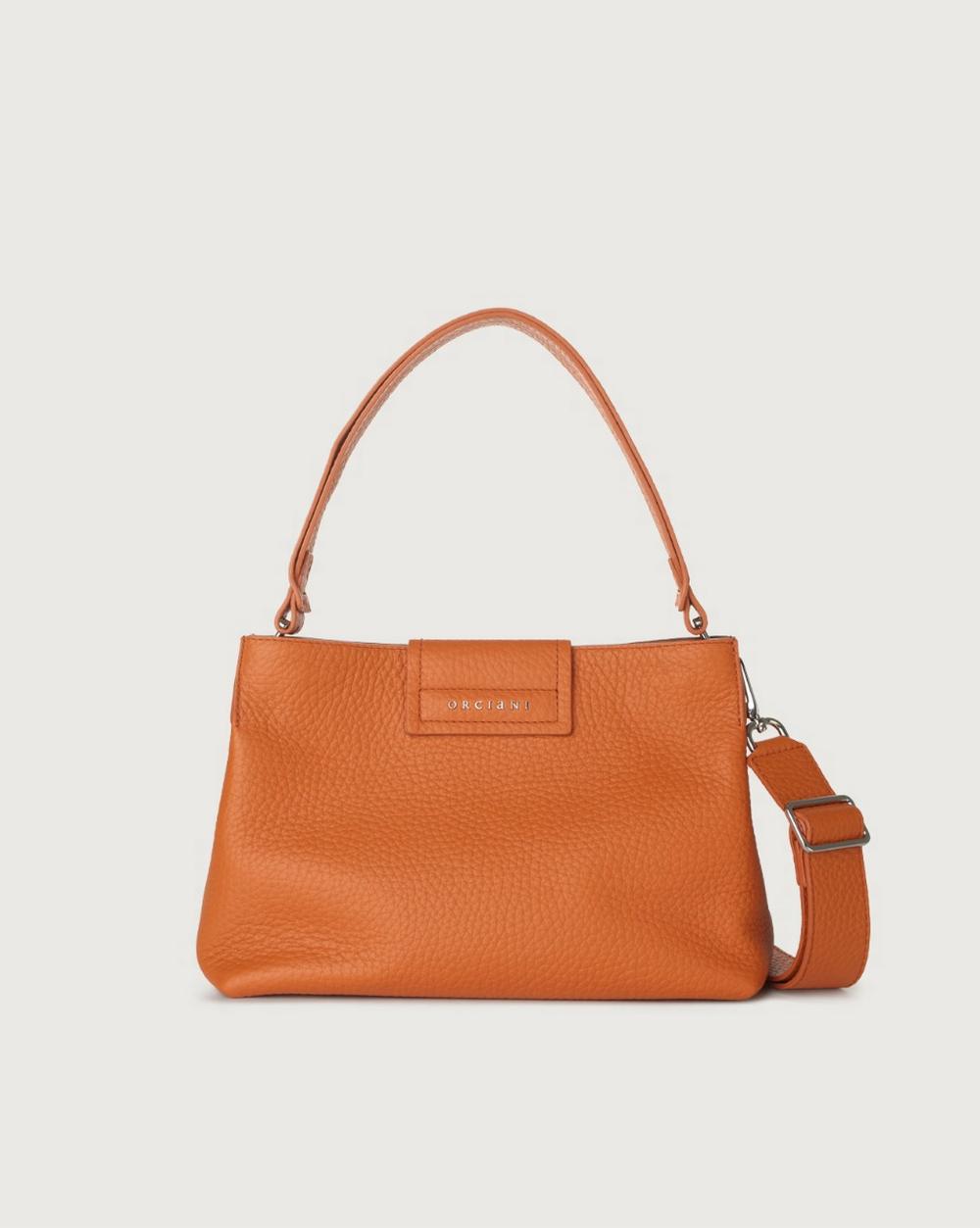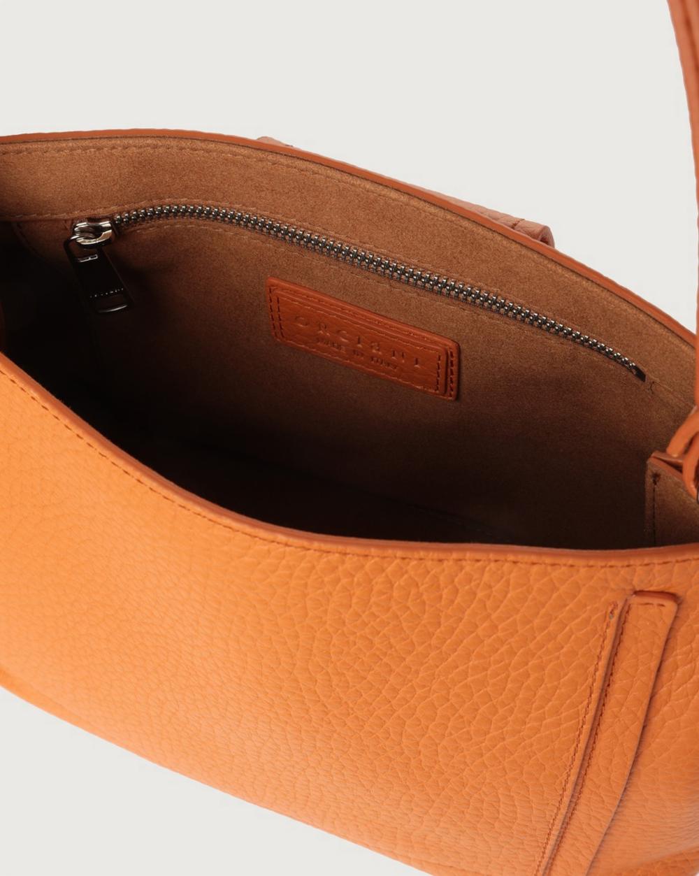 Borsa rettangolare in morbida pelle martellata color arancione nespola. Patta di chiusura con logo O metallico silver. Doppia tracolla per essere portata a mano o crossbody. Interno sfoderato con una tasca con zip e una applicata. Sul fronte cuciture decorative a cornice.