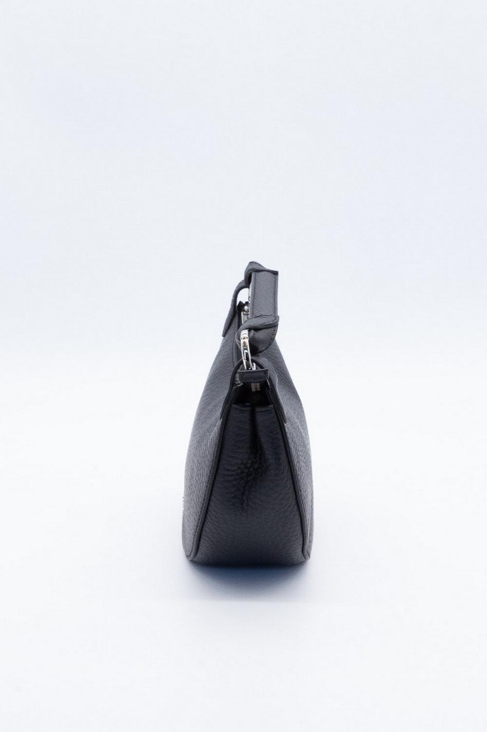 Borsa piccola modello Hobo a mezzaluna. in pelle martellata color nero. Manico per essere portata a mano e tracollina crossbody removibile a catena con spallaccio in pelle tono su tono. All'interno una taschina portacarte applicata. Chiusura con zip.