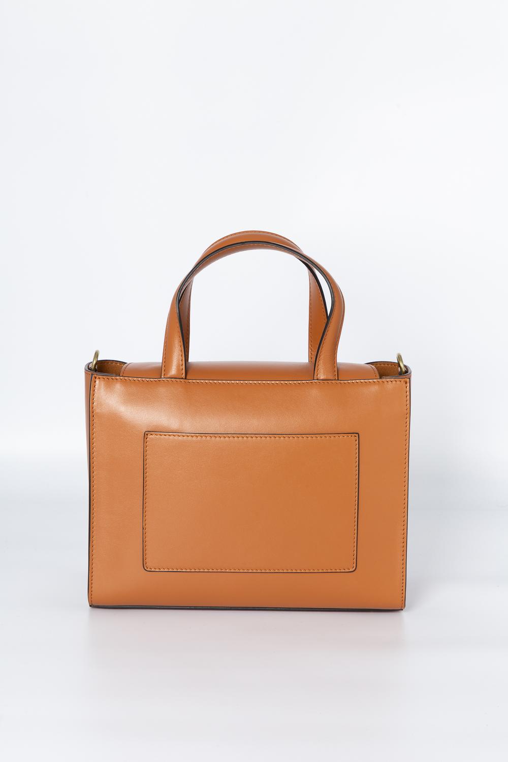 Borsa midi a mano in pelle liscia color ambra. Linea a trapezio, con doppio manico e tracollina di servizio abbinata, removibile. Chiusura con patta e bottone calamitato, nascosto dall'accessorio a O in metallo oro anticato, logo del brand. Una tasca sul retro aperta. Una tasca interna con zip e una aperta. Interno in nabuk.