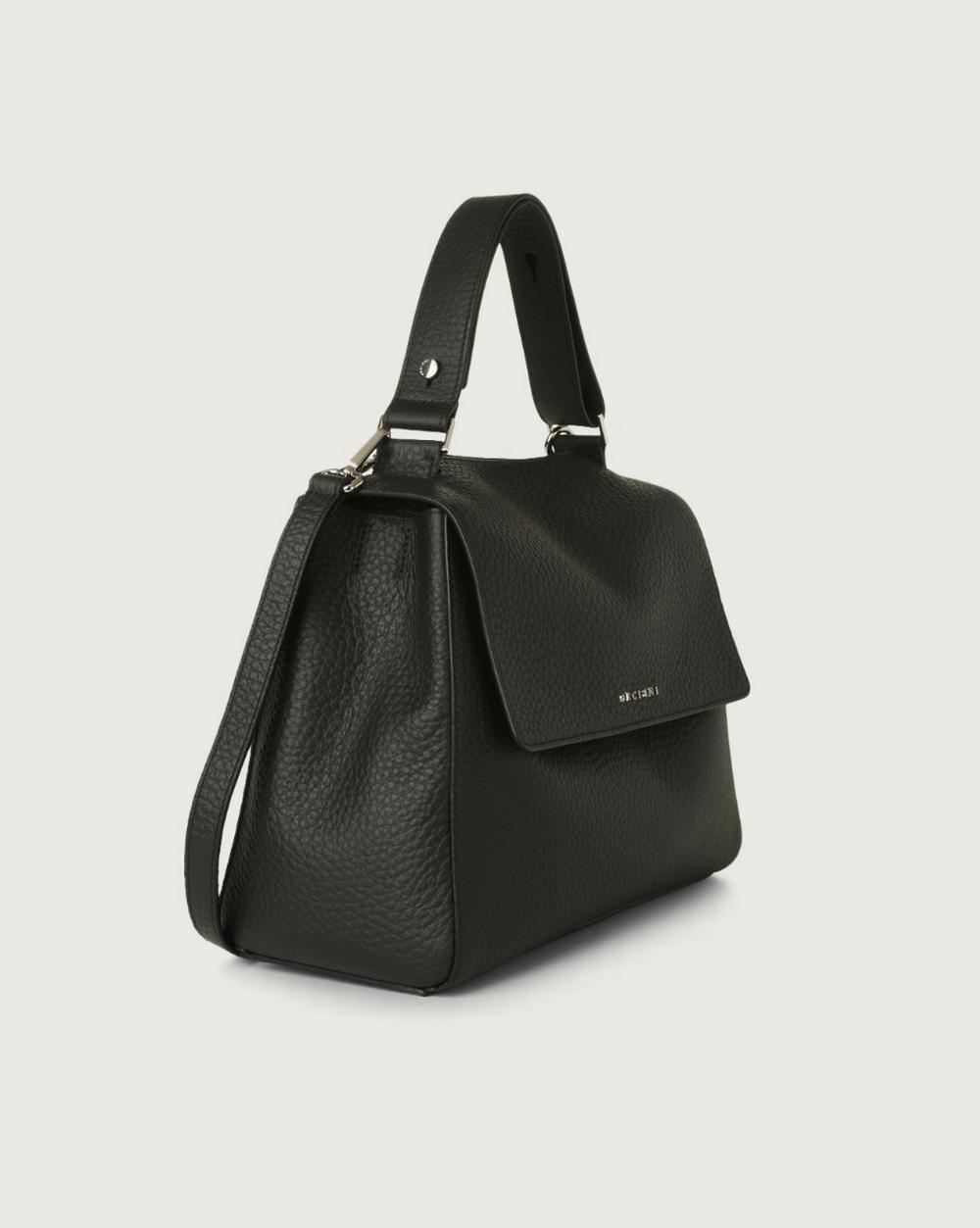 Borsa icona del brand Orciani, in morbida pelle martellata nera. Manico regolabile per utilizzo a mano o a spalla. Fornita di tracollina in pelle removibile, con moschettoni silver. Patta frontale con logo lettering e chiusura calamitata all' interno. Due tasche interne aperte e una con zip. Dettagli in metallo silver.