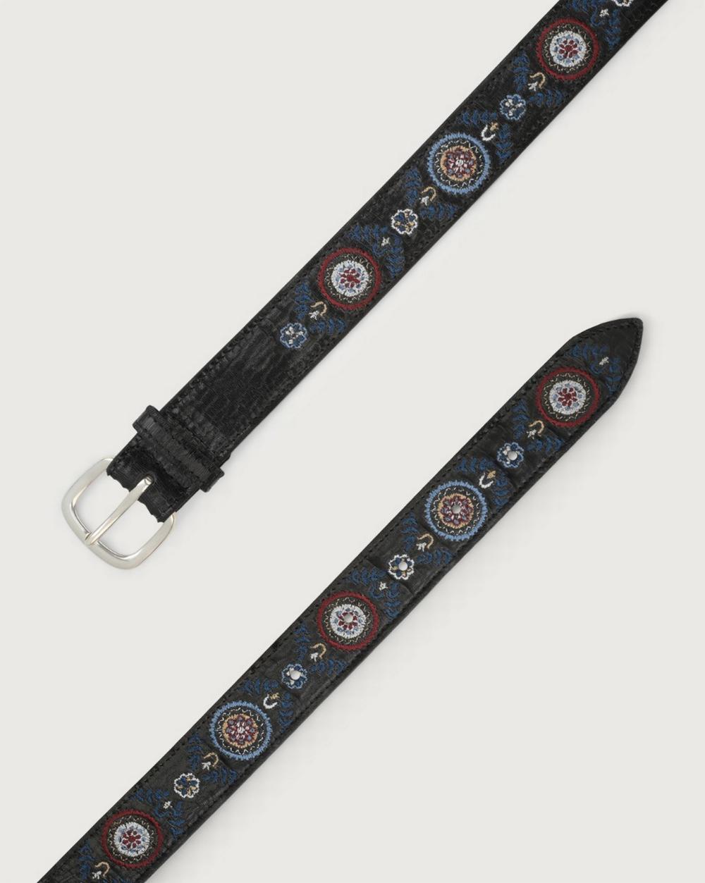 Cintura in pelle laserata nera con ricami geometrici sui toni dell' azzurro, blu e rosso. Fibbia con finitura argento inglese.