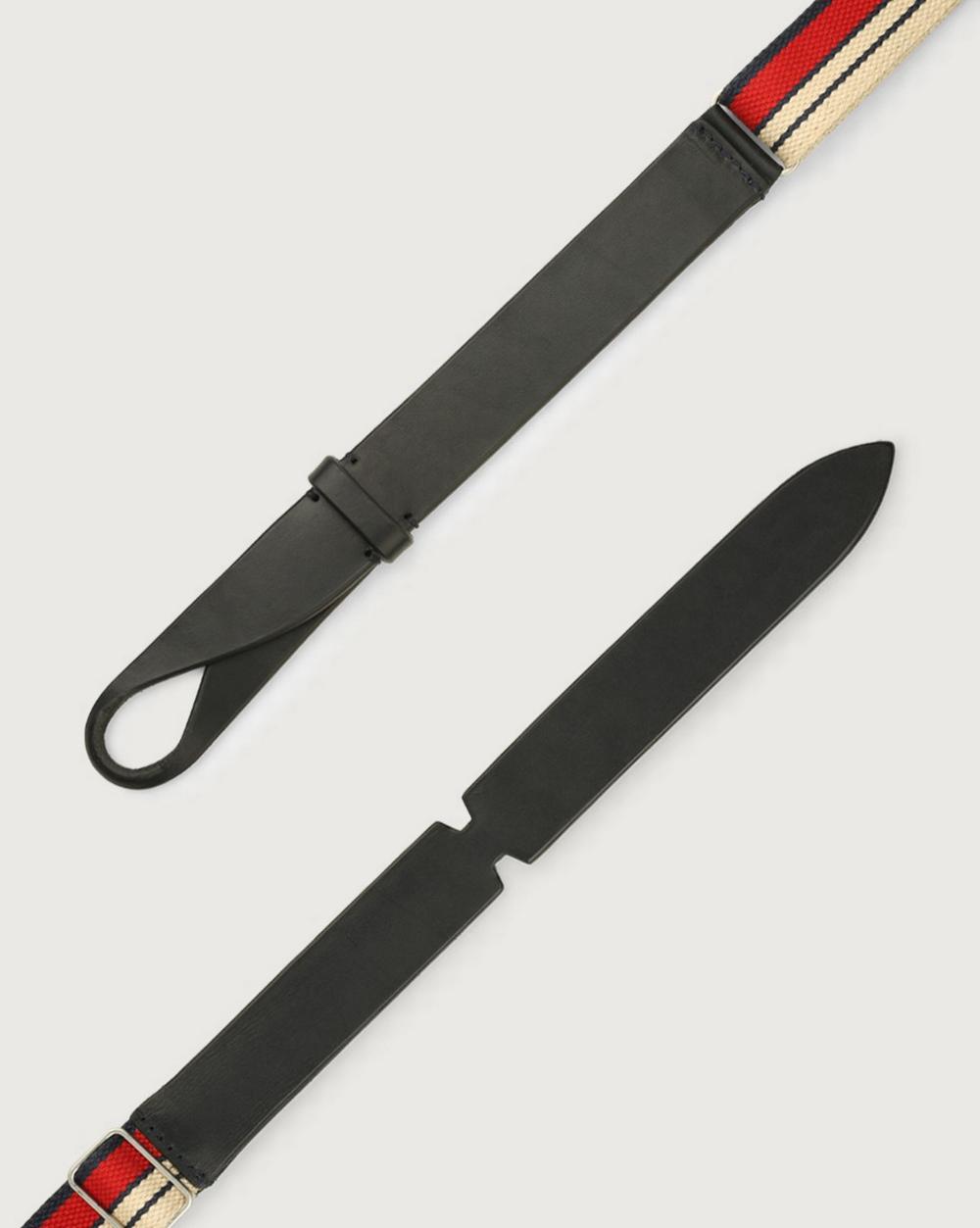 Cintura linea Nobuckle, senza fibbia, in pelle liscia blu sulla parte anteriore e tessuto a righe blu, bianco e rosso sulla parte posteriore. Anello scorrevole in nichel. Taglia unica regolabile dalla 42 alla 58.