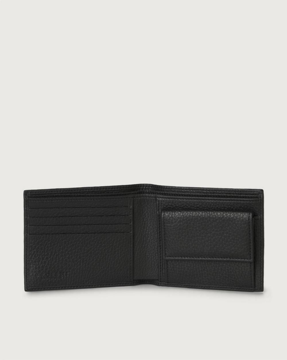 Portafoglio orizzontale in pelle martellata nera. Due scomparti superiori per banconote, scomparti porta tessere e una tasca porta monete con chiusura con bottone automatico. Logo O in metallo silver applicato esternamente.