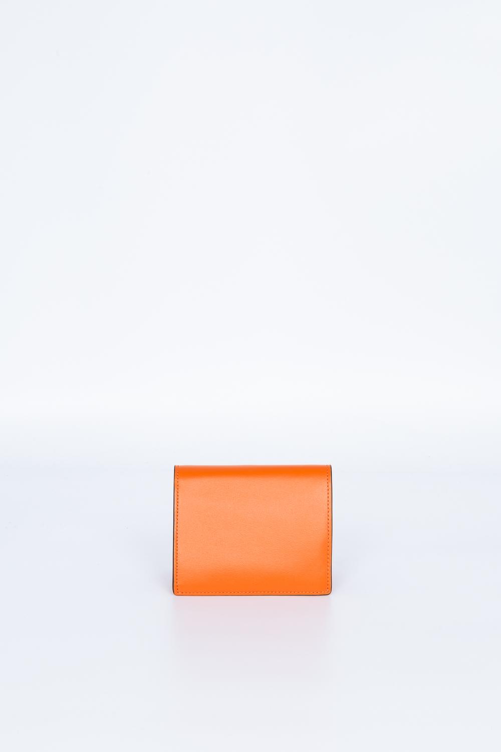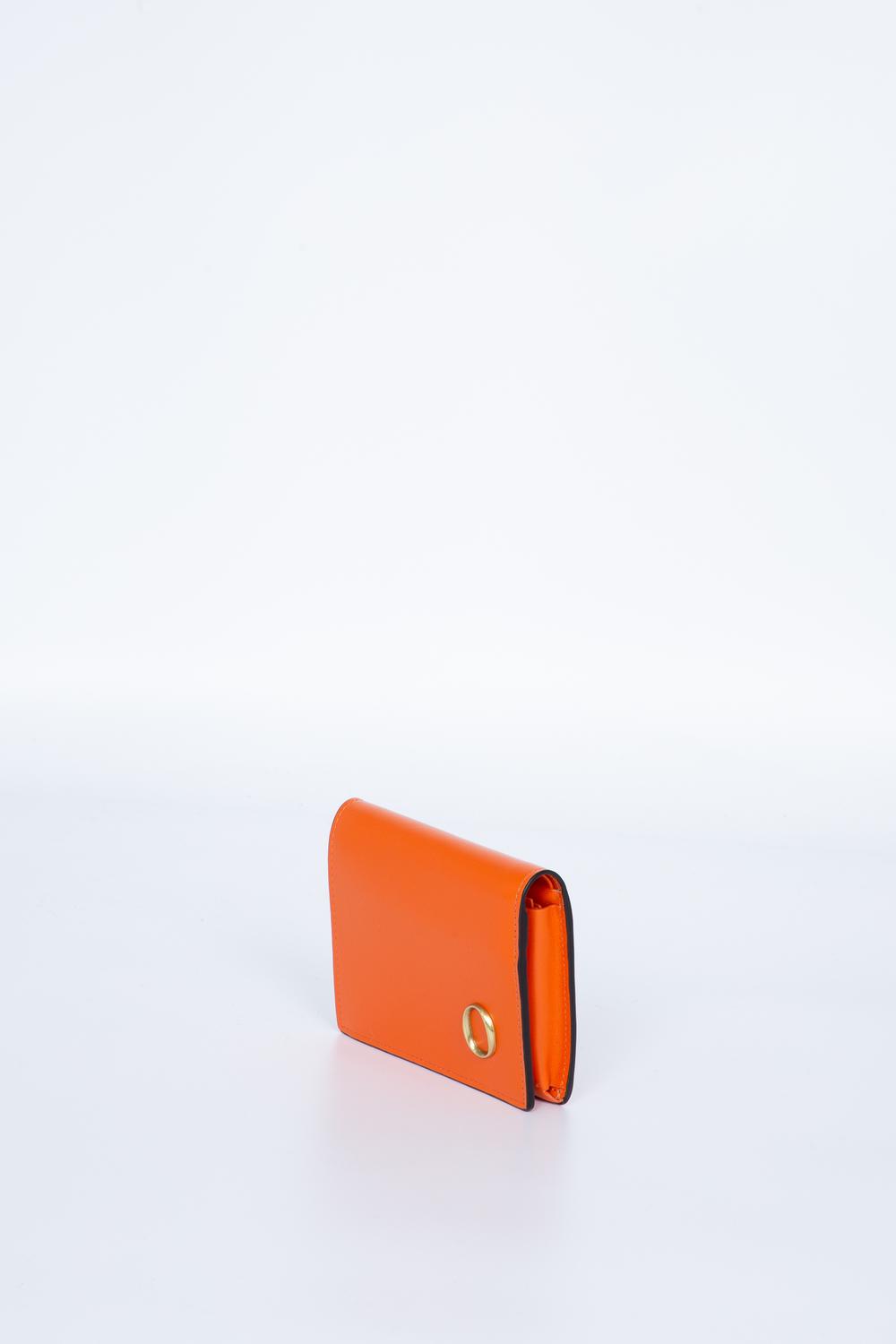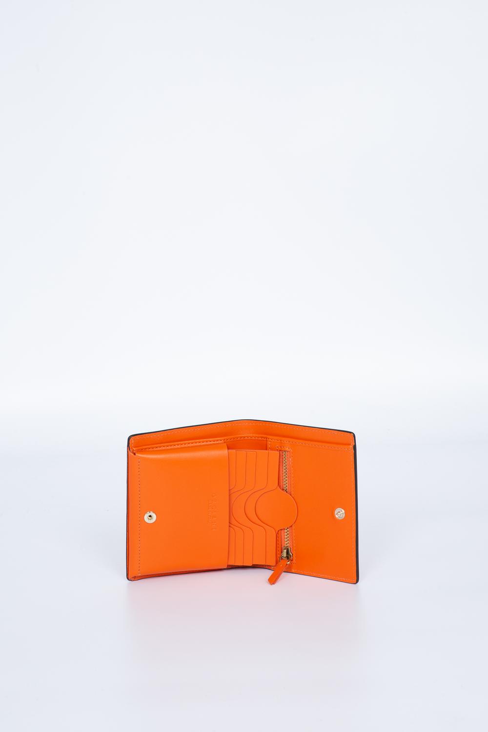 Portafoglio in pelle liscia color mandarino. Chiusura con automatico. Scomparto porta banconote e soffietto con porta tessere. Tasca zip porta monete. Misura piccola, adatta anche a mini bag.