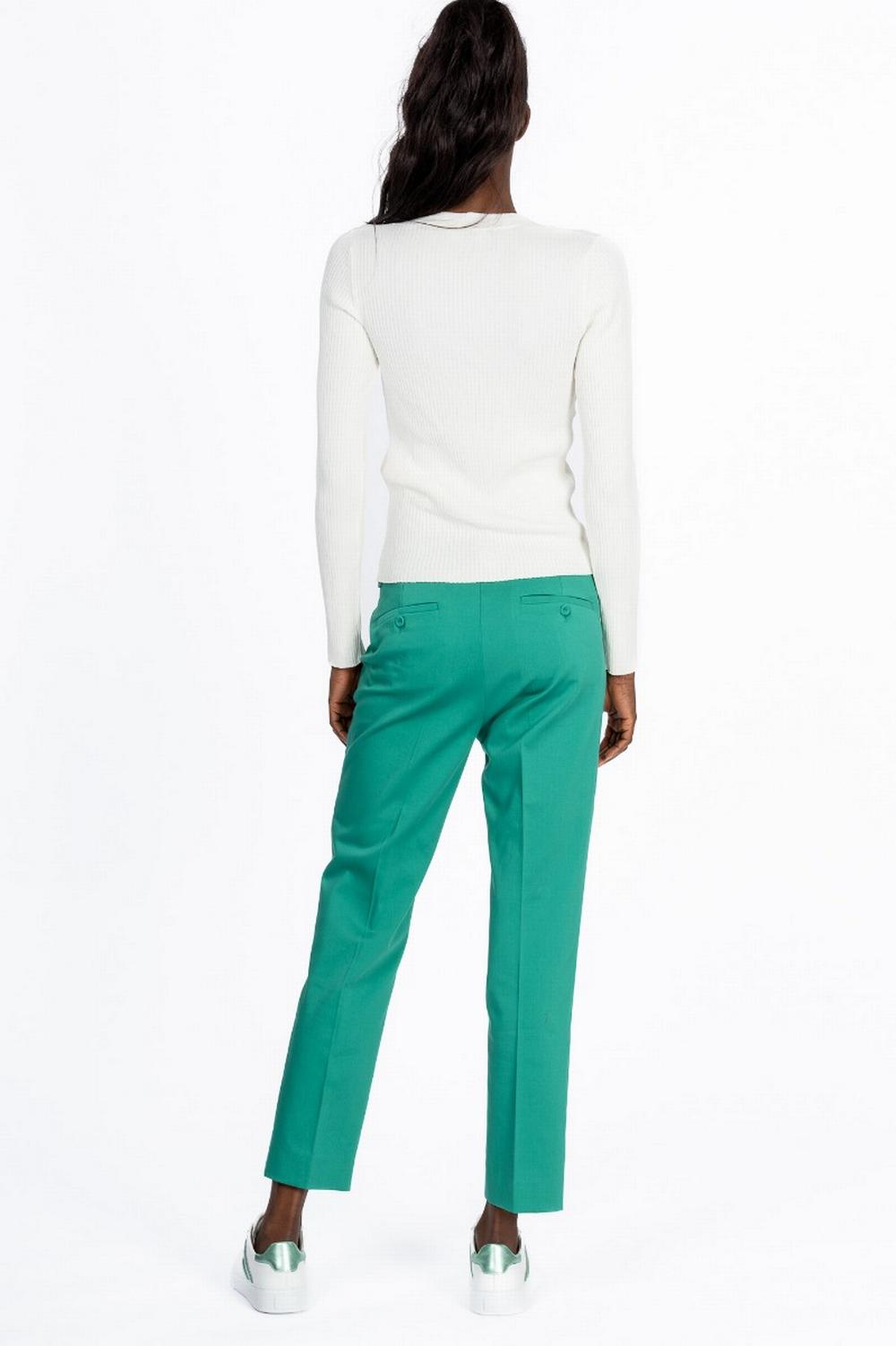 Pantaloni in raso di cotone color verde smeraldo, leggermente elasticizzati. Chiusura con gancio e zip nascosta. Linea semiaderente con piega stirata centrale. Tasche alla francese davanti e a filetto dietro.