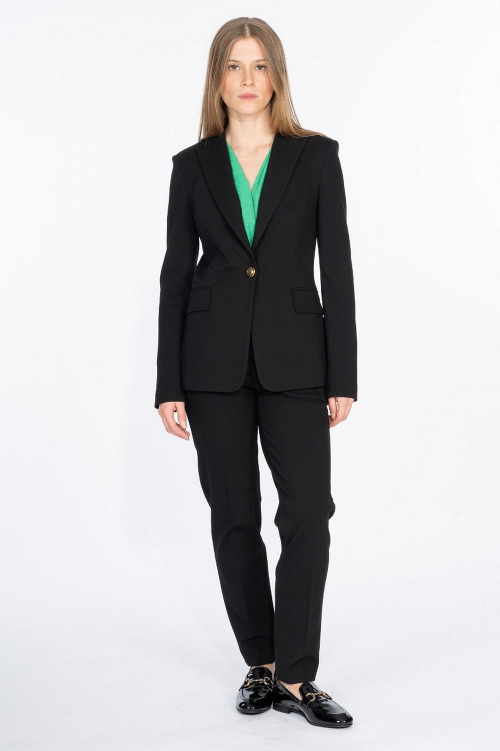 Giacca in panno stretch nero punto stoffa. Monopetto, chiusura con un bottone in metallo oro anticato lavorato. Collo con revers a lancia. Tasche inserite con pattina. Bottoni ai polsi. Foderata.