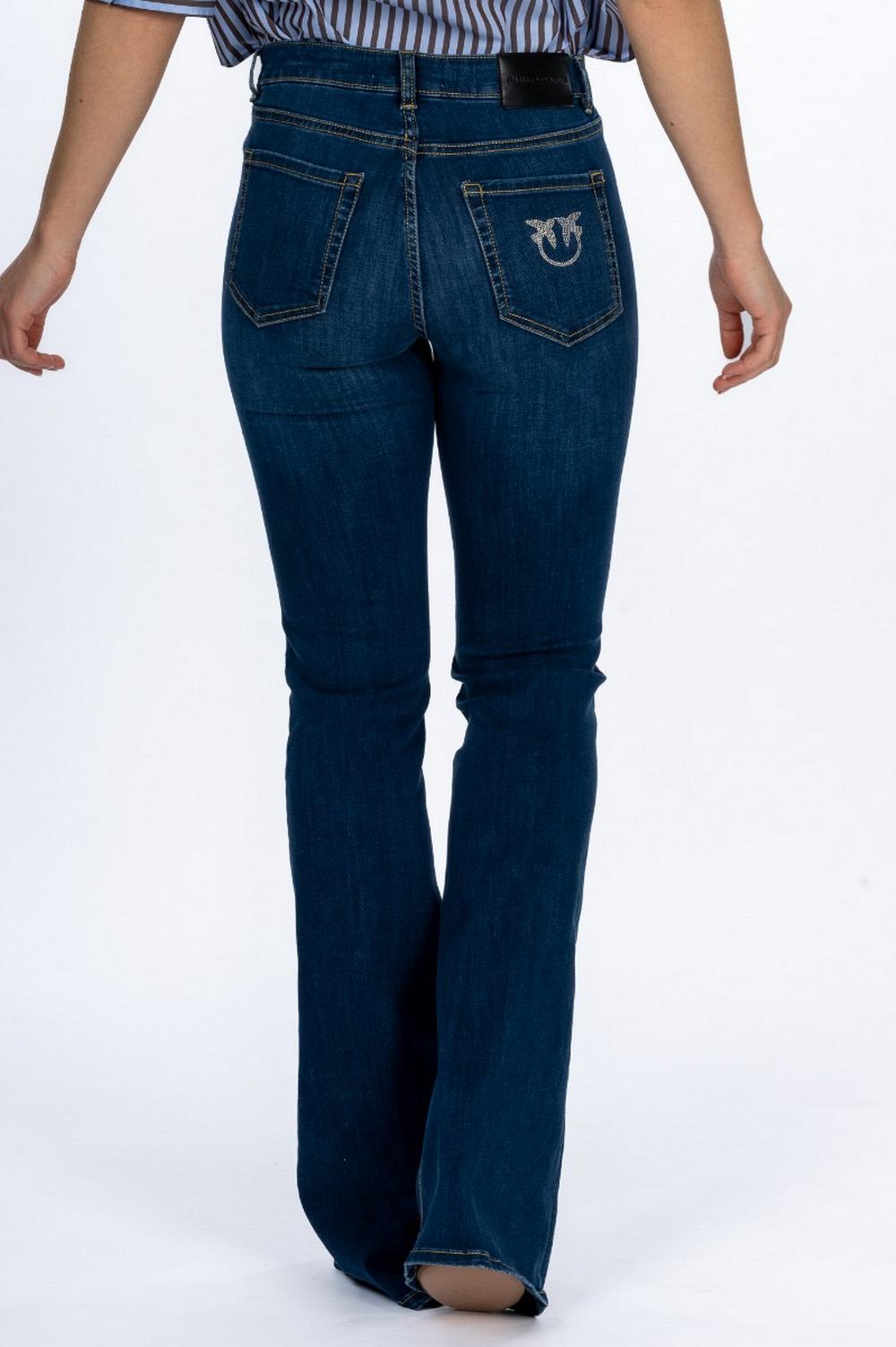 Jeans cinque tasche in denim elasticizzato super stretch. Modello flare, svasato sul fondo. Lavaggio scuro. Logo Pinko realizzato con microborchie sulla tasca posteriore. Chiusura con zip e bottone a vista.