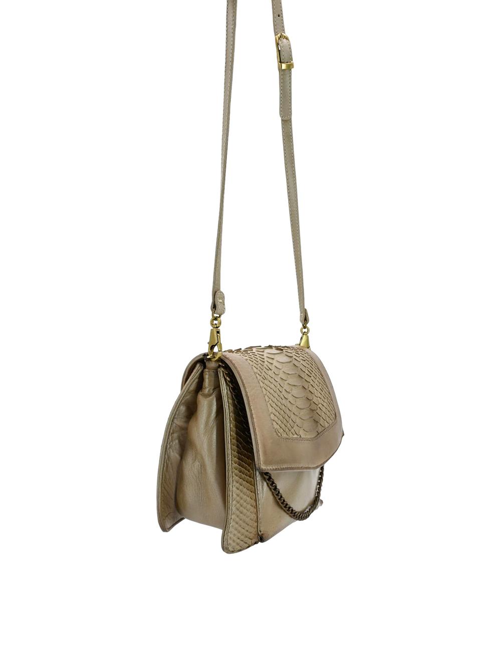Borsa piccola, in pregiata pelle di vitello con inserti in pitone, color champagne. Tracolla in pelle removibile e catena per uso a mano. Patta frontale con chiusura calamitata sul taschino esterno con zip. Tre scomparti interni.