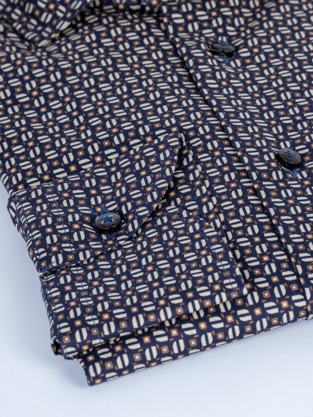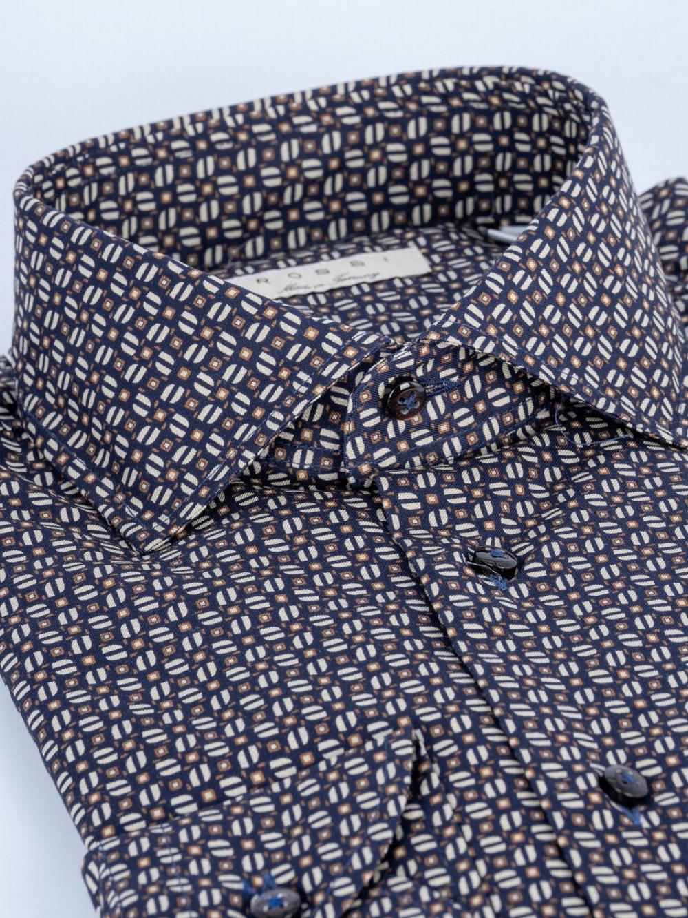 Camicia in leggero e morbido jersey di cotone, con fantasia geometrica sui toni del marrone su fondo blu scurissimo. Bottoni in tinta. Collo alla francese. Polso tondo. Tessuto finissimo di alta qualità.
