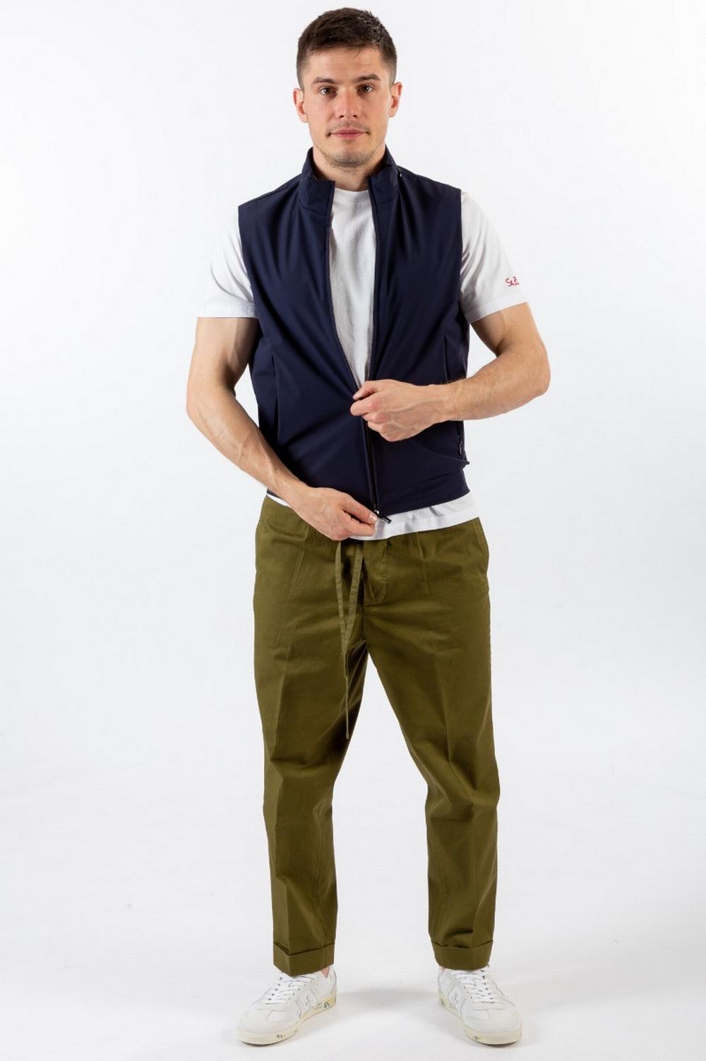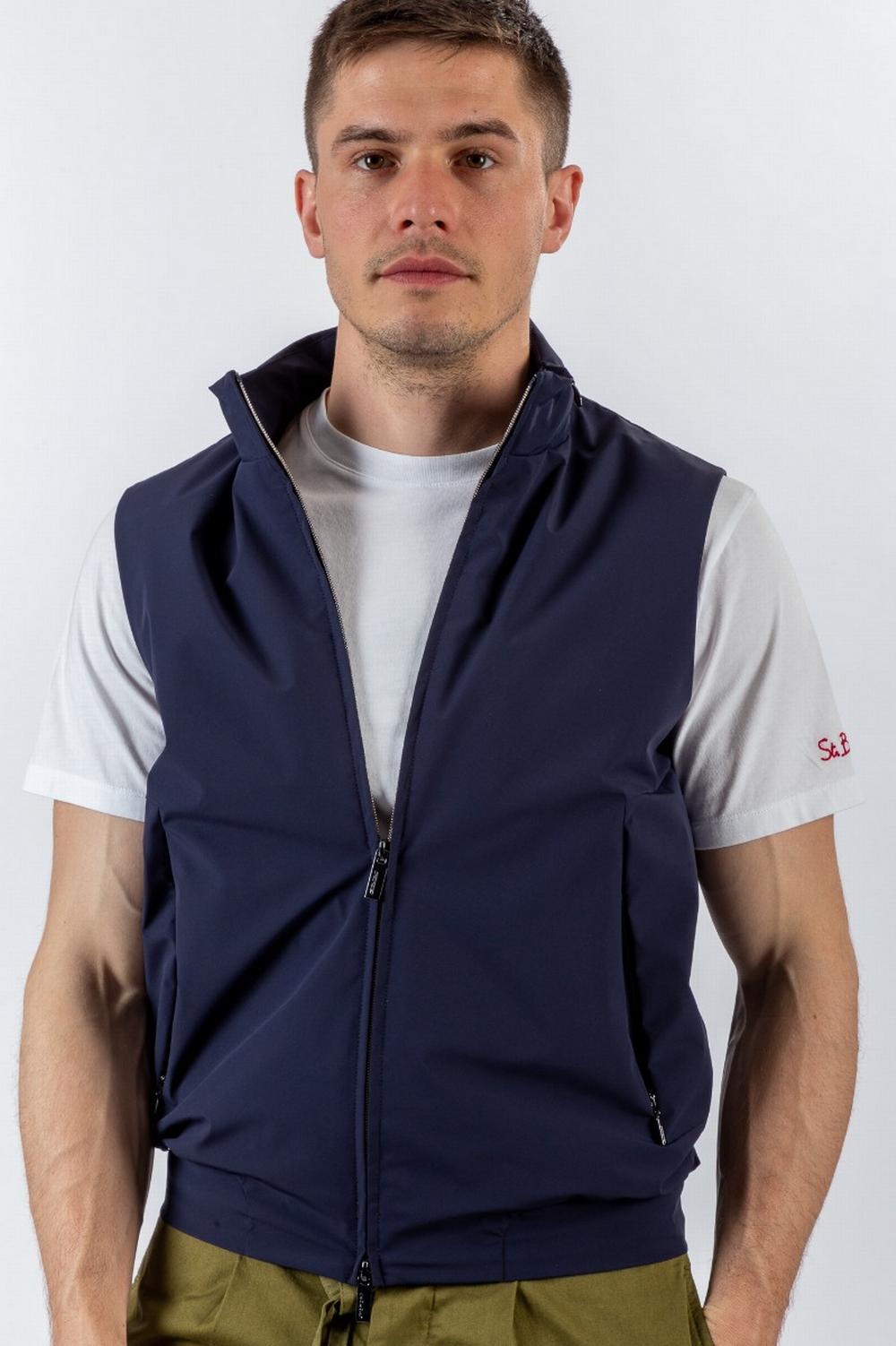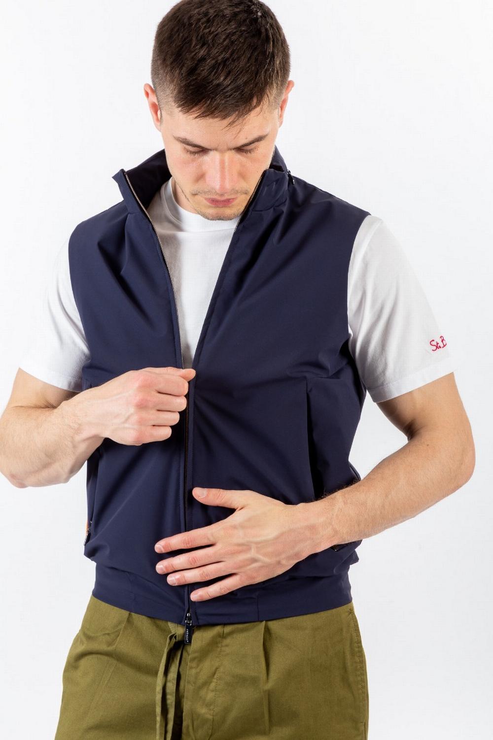 Giubbino senza maniche, primaverile, in tessuto tecnico stretch blu scuro. Chiusura con zip a doppio cursore. Colletto in piedi con cappuccio in nylon verdone inserito nel collo. Tasche con zip nascosta nelle cuciture. Una tasca interna con zip. Interno in nylon verdone.