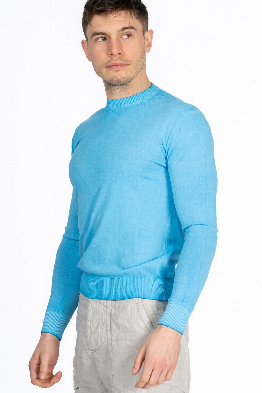 Maglia girocollo in morbido cotone spruzzato color turchese. Collo, fondo e polsi a coste. Calature a vista sul giro manica.