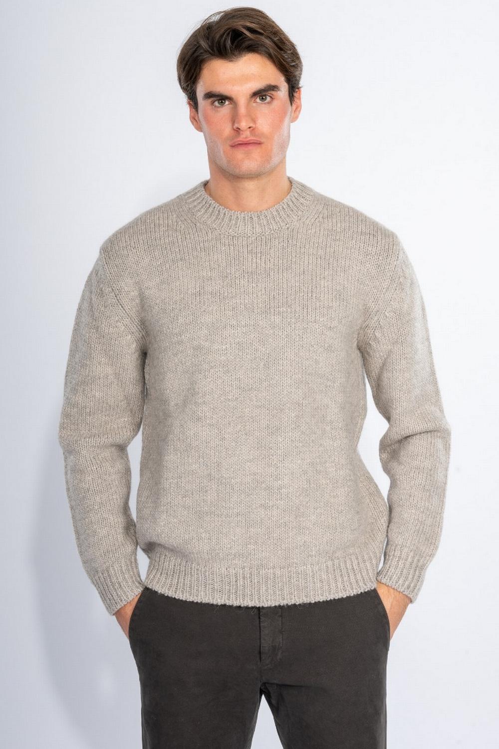 Maglione girocollo in lana misto alpaca beige. Lavorazione punto pannocchia. Collo, polsi e fondo a coste.