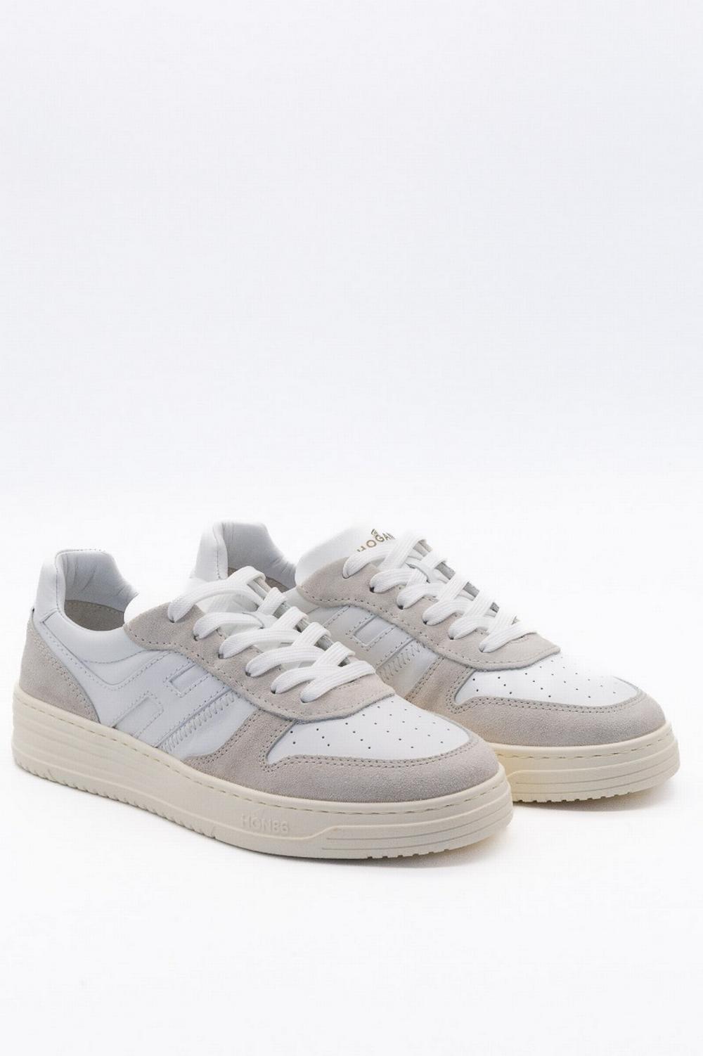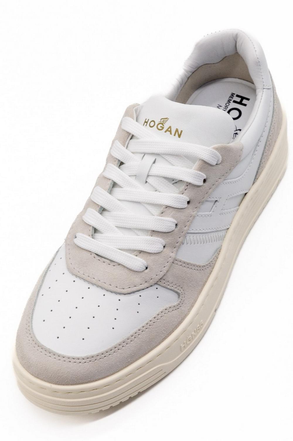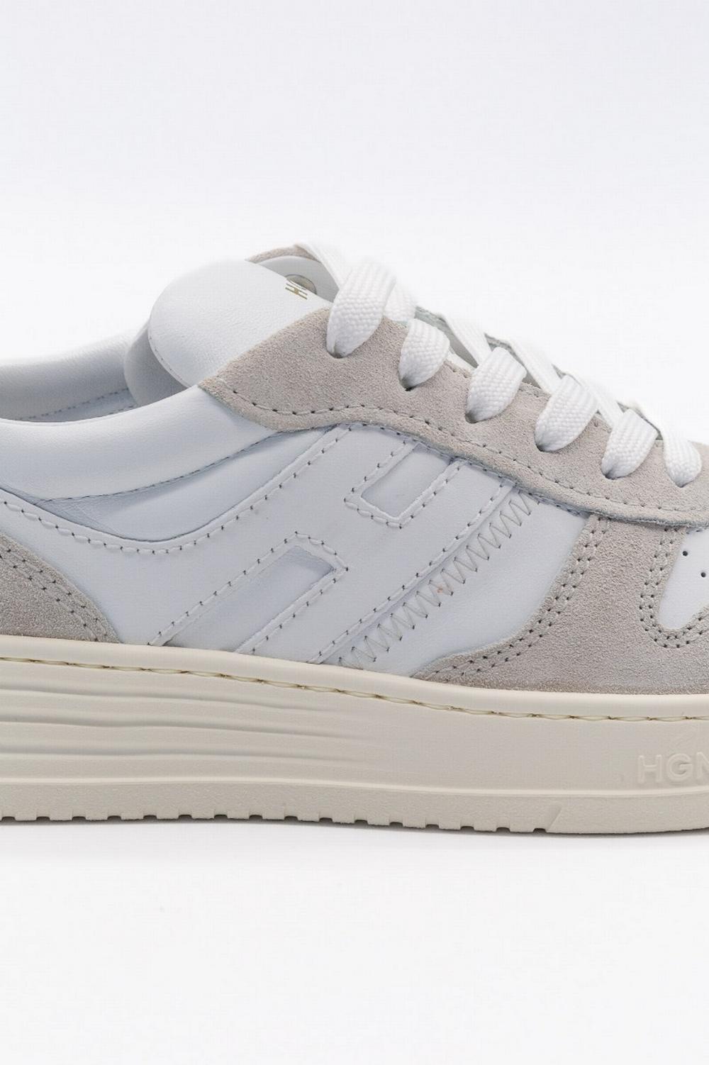 Nuovo modello di sneaker, must-have del guardaroba contemporaneo, dalla linea retrò e mondo basket. Tomaia in pelle liscia bianca con inserti scamosciati. Traforata sulla parte anteriore. H allungata in pelle bianca che gira intorno al tallone. Suola in EVA bianca extralight, con scanalature laterali. Fussbett in memory foam che assicura morbidezza e ammortizzazione.
