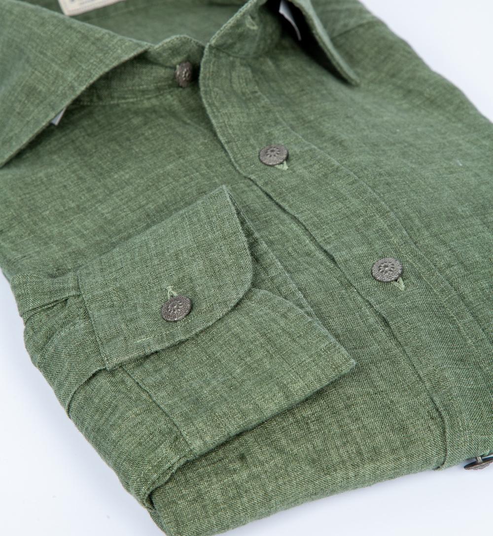 Camicia in puro lino color verde oliva. Bottoni in metallo con lavorazione floreale. Collo aperto alla francese. Polso Tondo. Slim fit. Linea Luxury.